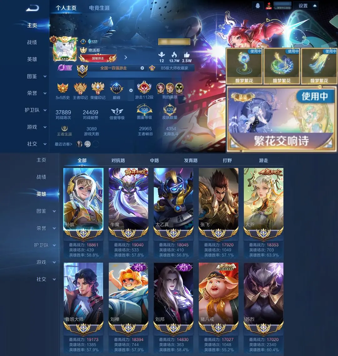 在榜全国百强游走112段辅王❤11个历史国服大乔孙膑等❤历史国服游走百段游走❤马年限定朵莉亚全屏天幕