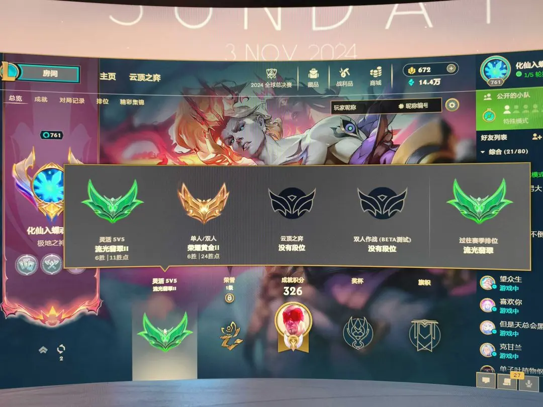 | 角色: 珂莱塔#63708 | 等级: 1100级 华贵铂金III |