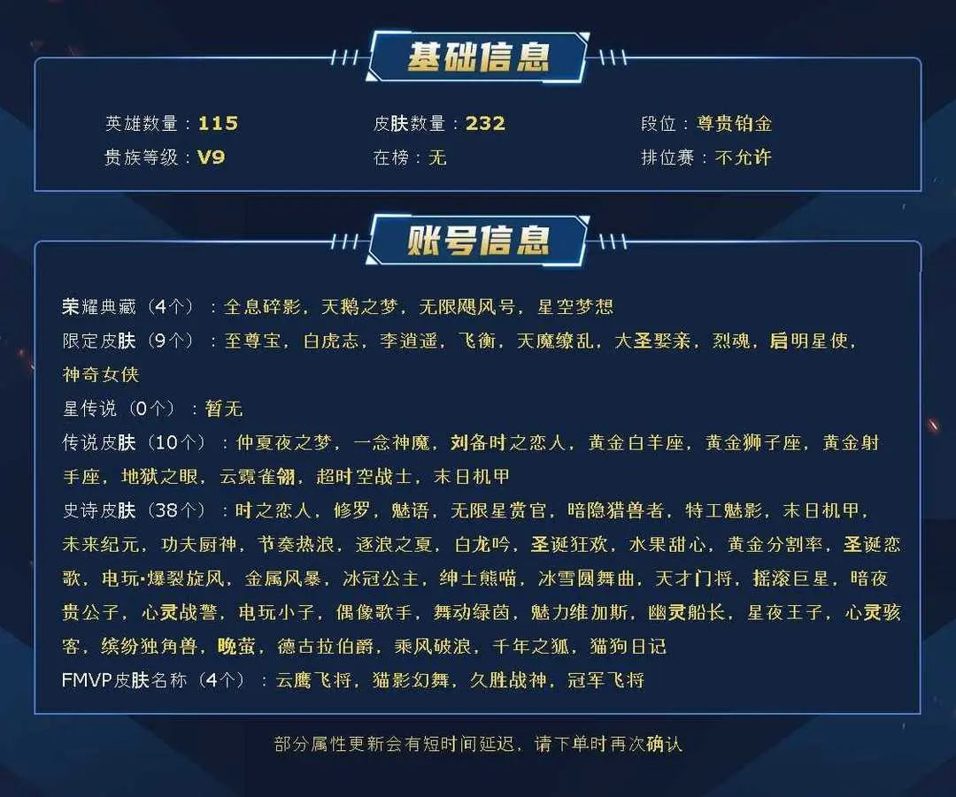毁号,涉及毁坏虚拟财产罪及计算机安全罪,请文明游戏素质游戏,让我们共建美好租号平台 本游戏账号: V8用户基础段位:永恒钻石IV英雄多皮肤多。典藏皮肤3个感受典藏皮肤带来的优质体验快感 私人所属英雄皮肤有:孙悟空 全息碎影夏侯惇 无限飓风号小乔 天鹅之梦赵云 淬星耀世虞姬 启明星使吕布 天魔缭乱李白 凤求凰武则天 海洋之心后羿 黄金射手座杨戬 永曜之星诸葛亮 武陵仙君孙尚香 末日机甲孙悟空 地狱火等等 注意事项: A.游戏过程中请不要恶意挂机或者不文明发言B.恶意挂机、顶号等行为将被拉黑无法再次下单C.进入游戏后中途请勿退出登陆,否则无法再次上号D.部分账号由于异地登录可能会出现密码错误提示,通常再尝试5-6次后可上号。 喜欢本账号请点 ☆收藏☆ 方便下次租用,谢谢光临惠顾