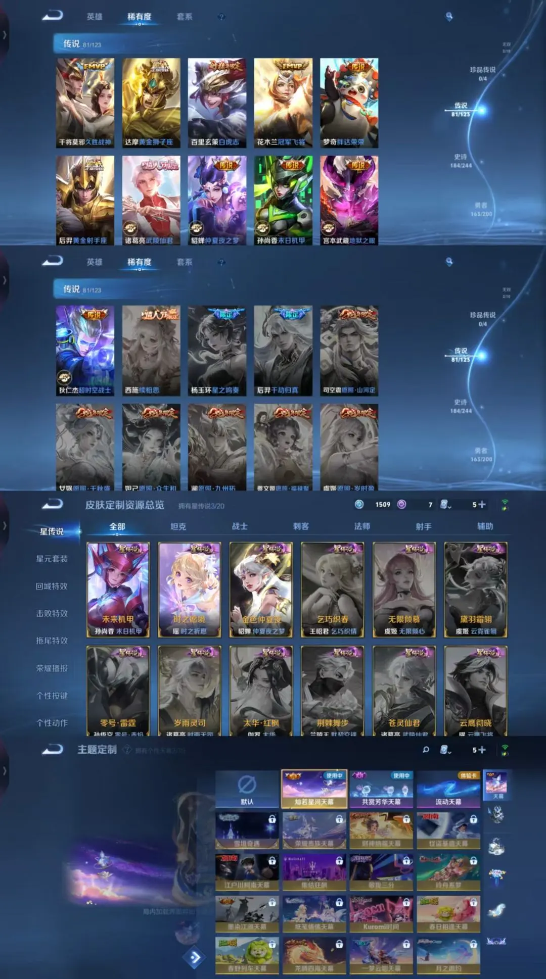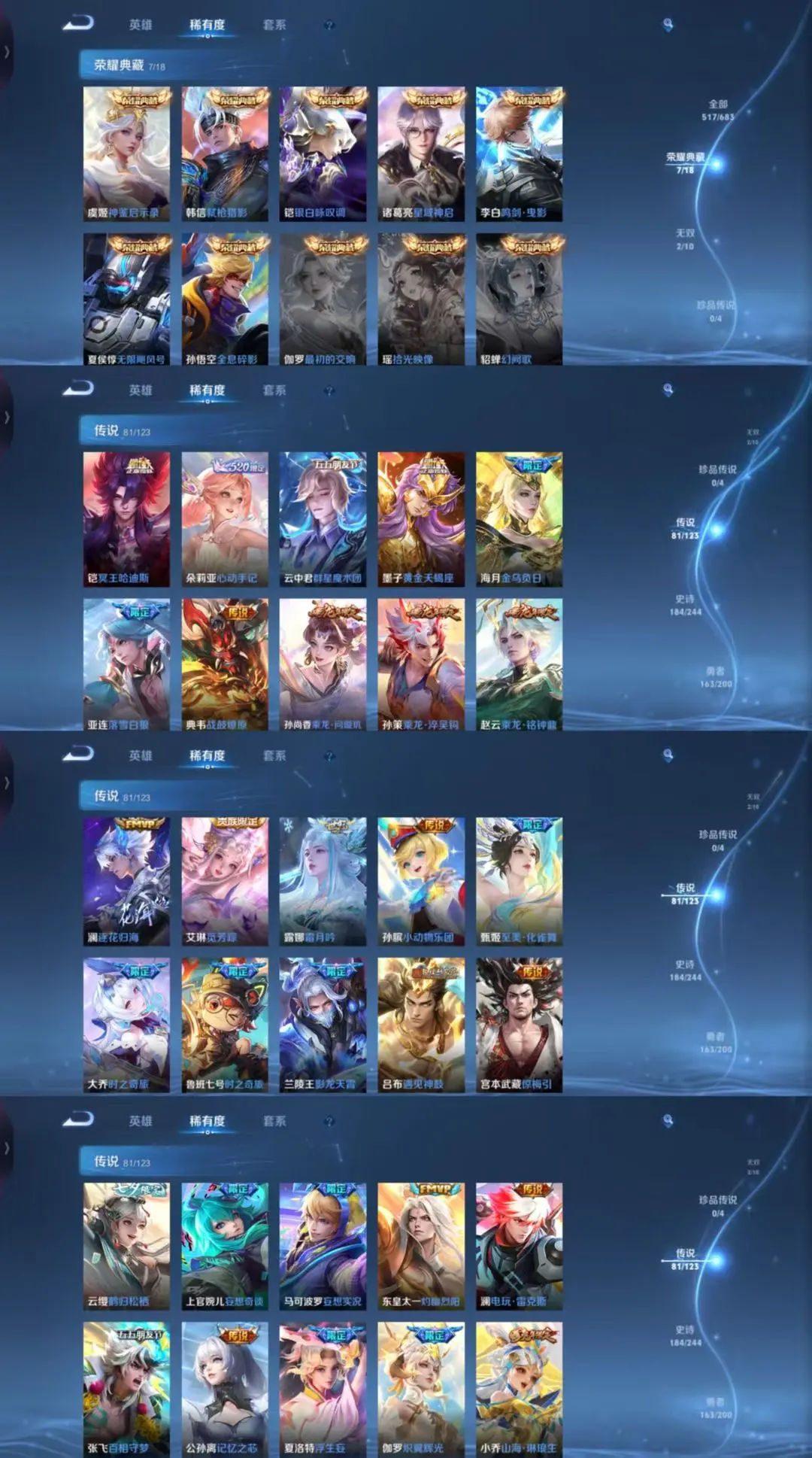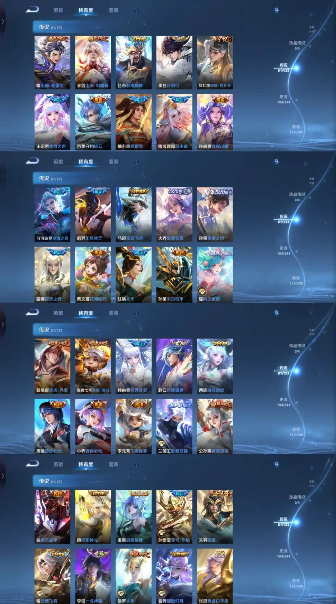 【81 传说皮肤】枫霜尽 橘右京,胖达荣荣 梦奇,鹤归松栖 云缨,武圣 关羽,星穹之声 王昭君,启明星使 虞姬,前尘镜 娜可露露,花朝如约 蔡文姬,碎云 百里守约,逐花归海 澜,时之祈愿 瑶,电玩·雷克斯 澜,飞鸢探春 李元芳,无双飞将 马超,白虎志 百里玄策,零号·赤焰 孙悟空,云鹰飞将 曜,补天 女娲,神器·狴犴令 狄仁杰,深海之息 马可波罗,觅芳踪 艾琳,游龙清影
