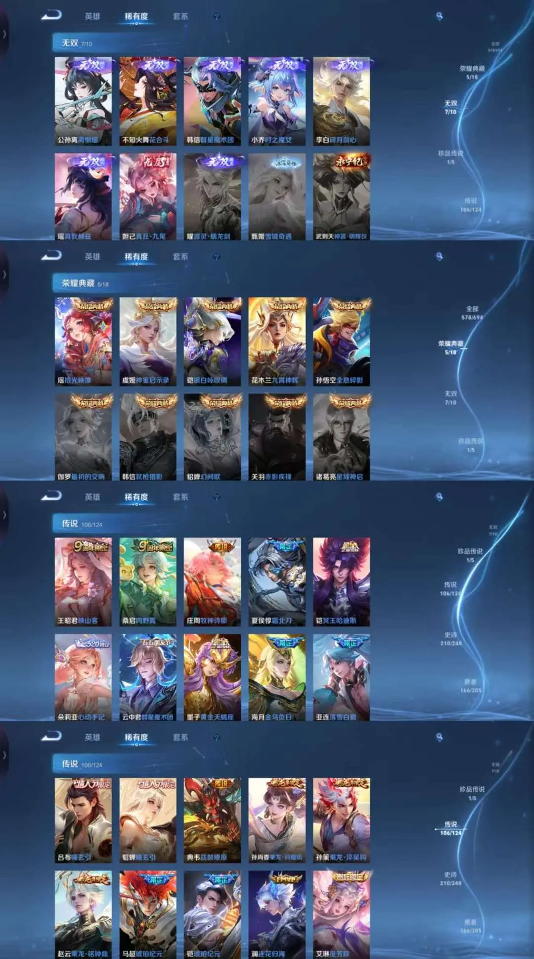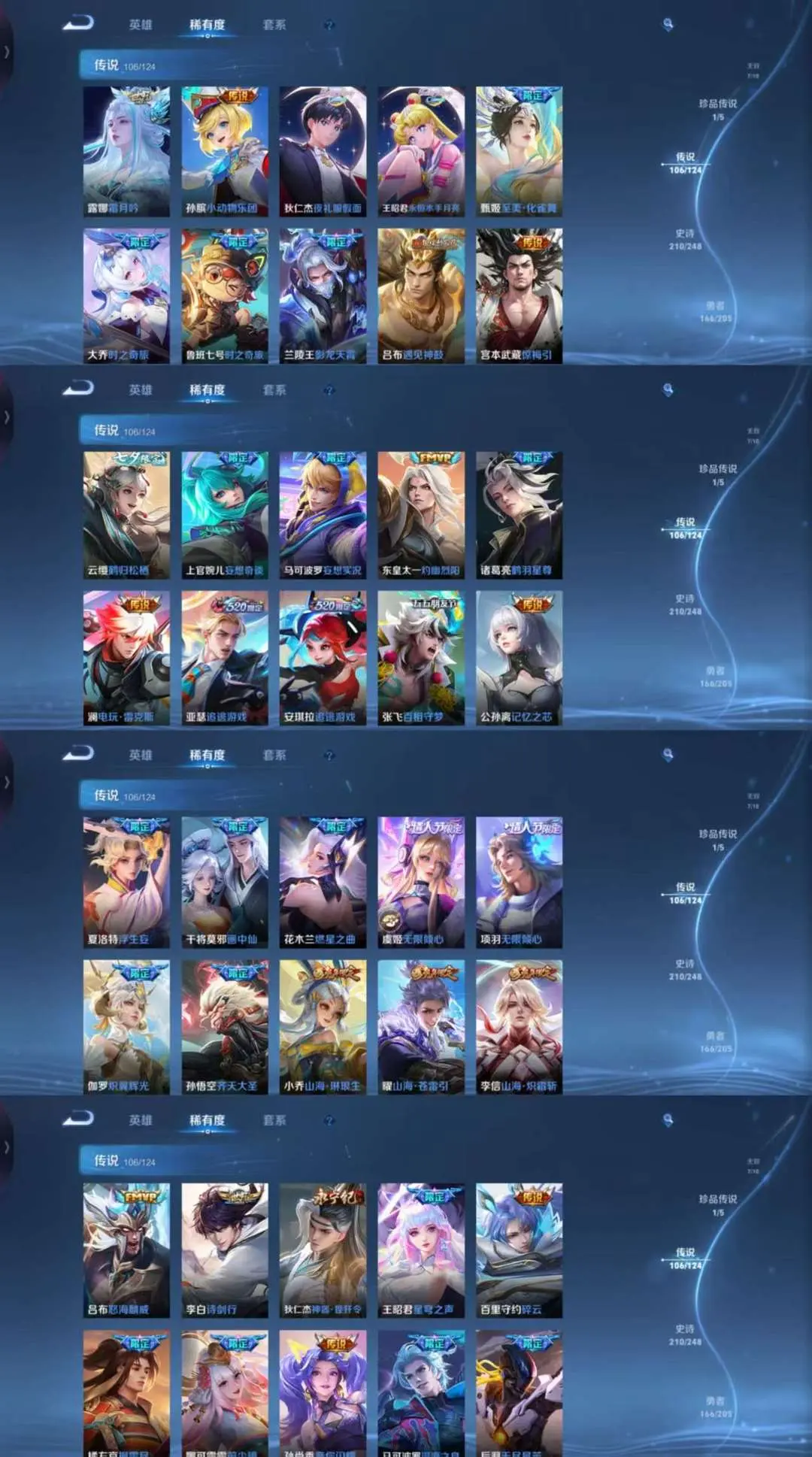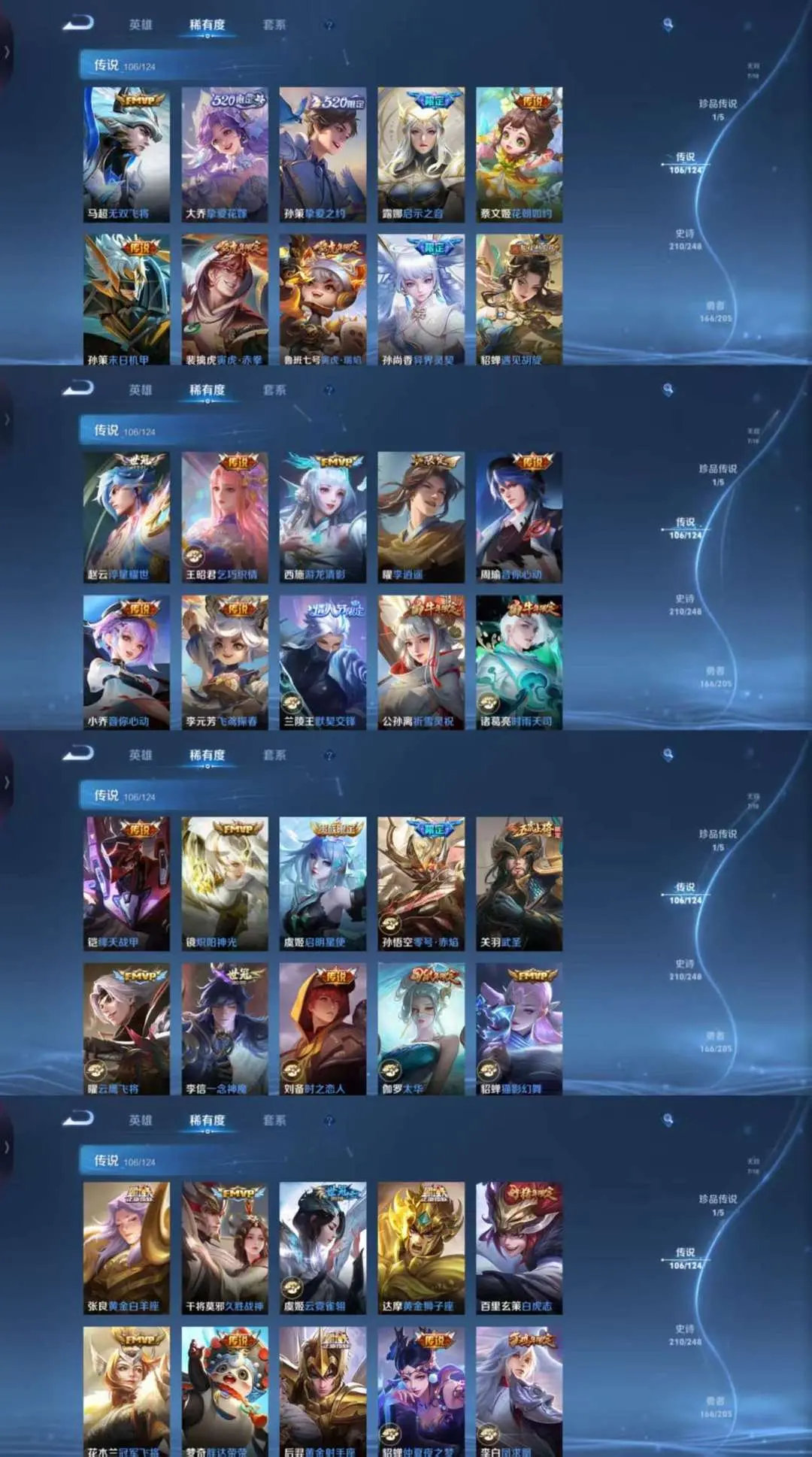 【106 传说皮肤】枫霜尽 橘右京,胖达荣荣 梦奇,鹤归松栖 云缨,武圣 关羽,星穹之声 王昭君,永恒水手月亮 王昭君,启明星使 虞姬,云霓雀翎 虞姬,前尘镜 娜可露露,无限倾心 虞姬,花朝如约 蔡文姬,碎云 百里守约,逐花归海 澜,电玩·雷克斯 澜,飞鸢探春 李元芳,无双飞将 马超,白虎志 百里玄策,李逍遥 曜,零号·赤焰 孙悟空,地狱火 孙悟空,云鹰飞将 曜,齐天大圣 孙悟空,夜礼服假面 狄仁杰,神器·狴犴令 狄仁杰,追逃游戏 亚瑟,深海之息 马可波罗,觅芳踪 艾琳,游龙清影 西施,追逃游戏 安琪拉,凤求凰 李白,诗剑行 李白,燃星之曲 花木兰,灼幽烈阳 东皇太一,浮生妄 夏洛特,遇见胡旋 貂蝉,猫影幻舞 貂蝉,仲夏夜之梦 貂蝉,落雪白狼 亚连,惊梅引 宫本武藏,影龙天霄 兰陵王,记忆之芯 公孙离,地狱之眼