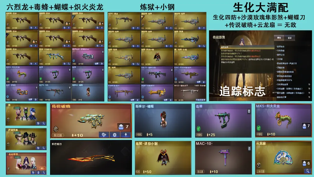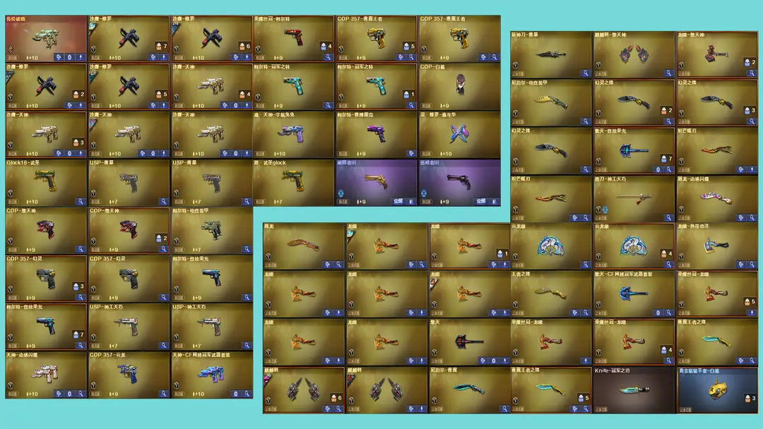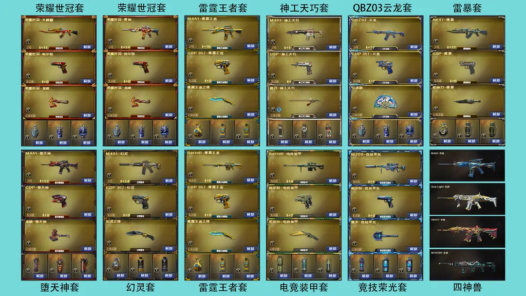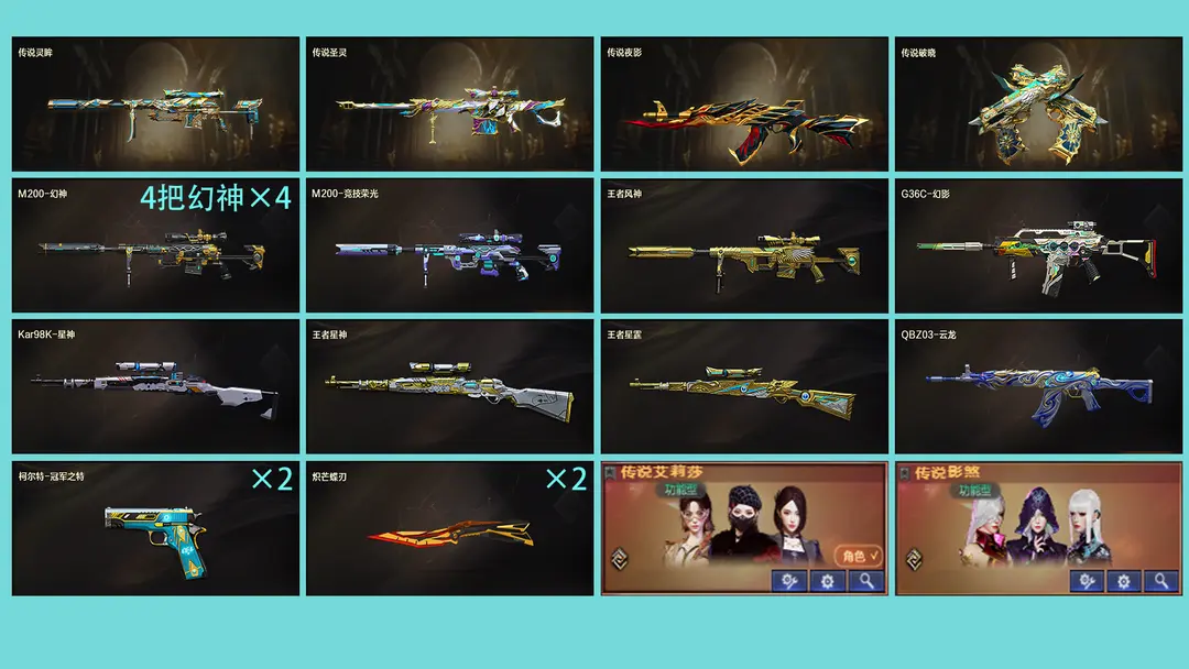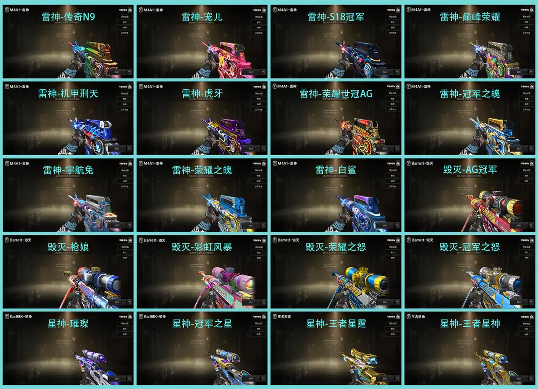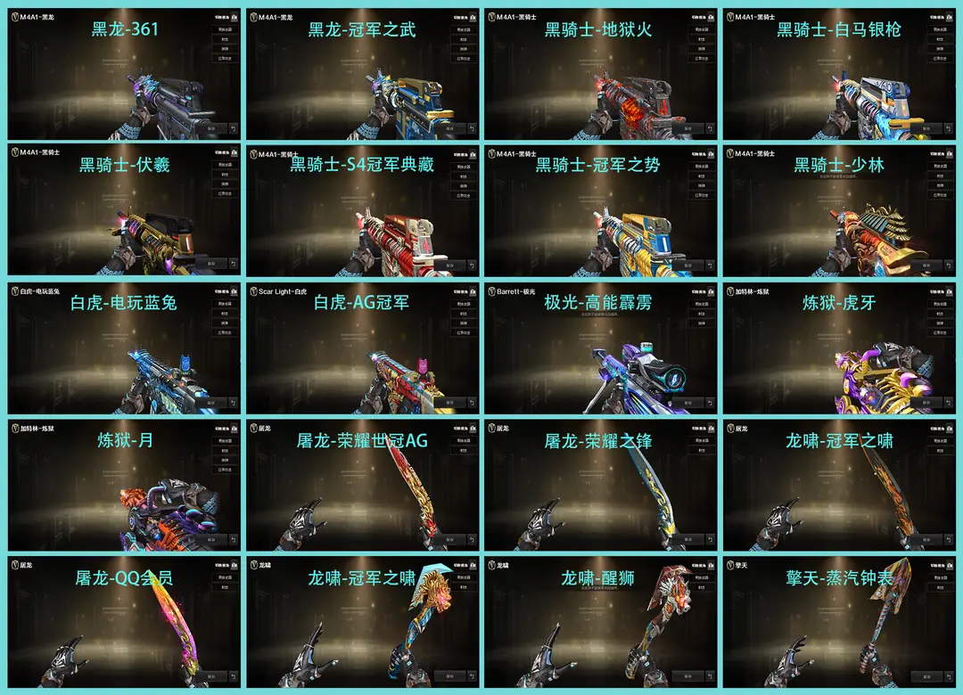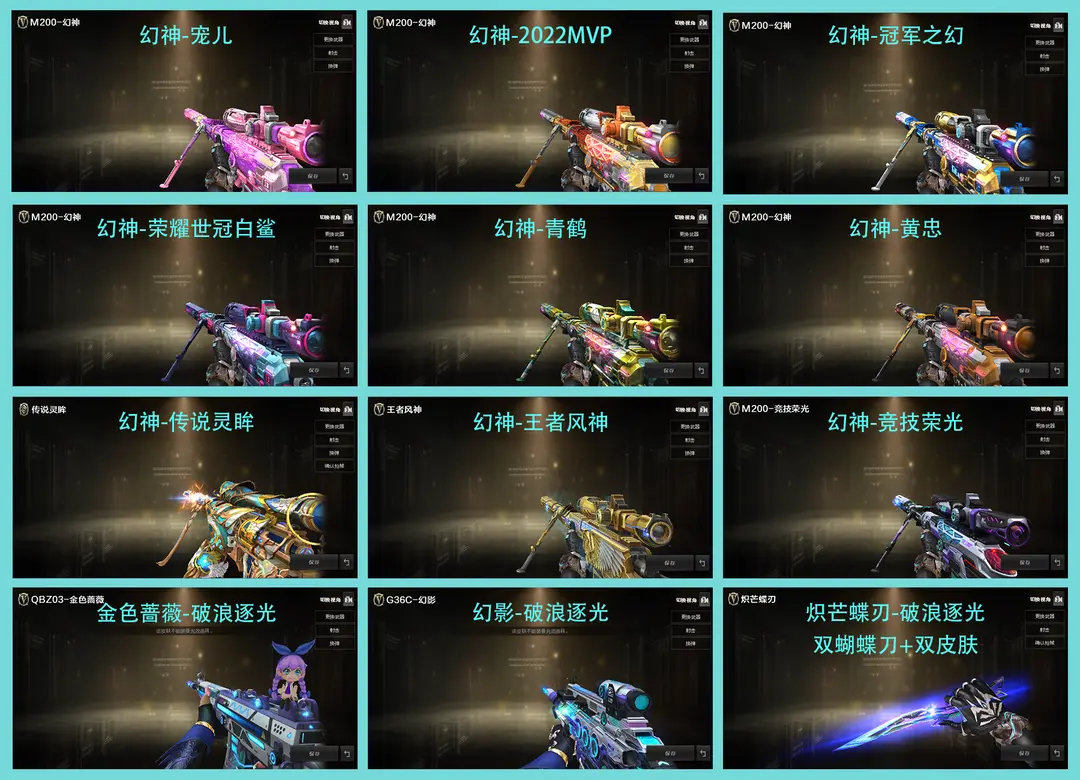 幻影破浪逐光,炽芒蝶刃破浪逐光,金色蔷薇破浪逐光,传说影煞,传说破晓,传说灵眸,传说艾莉莎,传说圣灵,传说夜影,幻神N92022MVP,幻神宠儿2021MVP,幻神黄忠,幻神冠军之幻,幻神荣耀世冠白鲨,幻神青鹤,炽芒蝶刃,蝴蝶刀,柯尔特冠军之特,冠军之刃,Kar98K星神音效卡,加特林炼狱音效卡,毁灭音效卡,雷神音效卡,黑龙音效卡,QBZ03金色蔷薇音效卡,M200幻神音效卡,极光音效卡,黑骑士音效卡,火麒麟音效卡,ScarLight白虎音效卡,龙啸热带奇洋音效卡,全音效卡,Mk5-炽火炎龙,沙漠玫瑰,隼,斯泰尔蝴蝶,金色蔷薇纸灯龙,QBZ03-巅峰荣耀,QBZ03-AG-CFPLs19冠军,QBZ03云龙,COP357云龙,云龙扇,雷神巅峰荣耀,Kra98K-星神-冠军之星,黑龙冠军之武,白虎AG-CFPLS20冠军,火麒麟荣耀世冠AG,雷神荣耀世冠AG,星神璀璨,毁灭AGCFPLS15冠军,雷神传奇N9,雷神虎牙平台皮肤,荣耀之魄荣耀之怒荣耀之锋,冠军之啸冠军之魄冠军之魂冠军之心冠军势,炼狱虎牙,生化满配,挑战满配,爆破全装满配,宗师,大师,传奇,枪王,荣耀枪王,荣耀之巅等