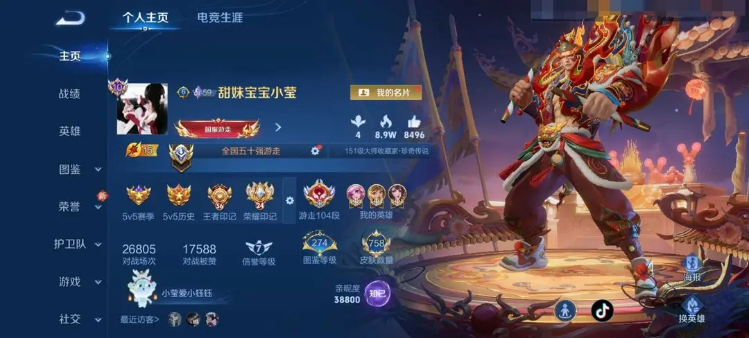 禁言⚡️在榜50强女号小国标104段游走✨猴子无相新皮✨10大国服瑶大乔孙膑✨满水晶满无双满珍品