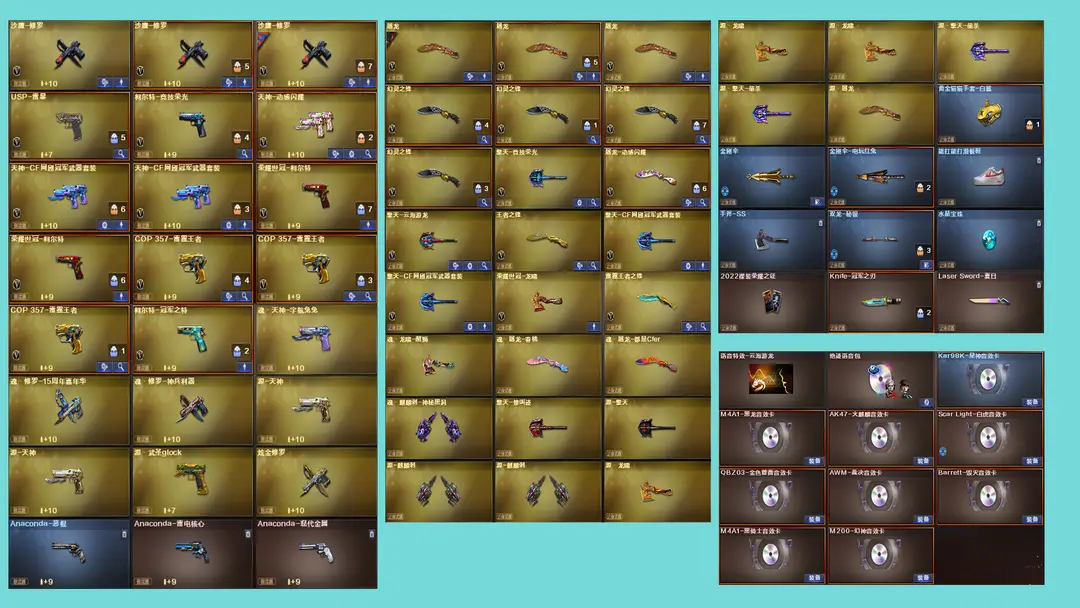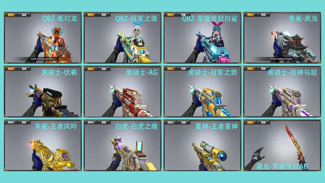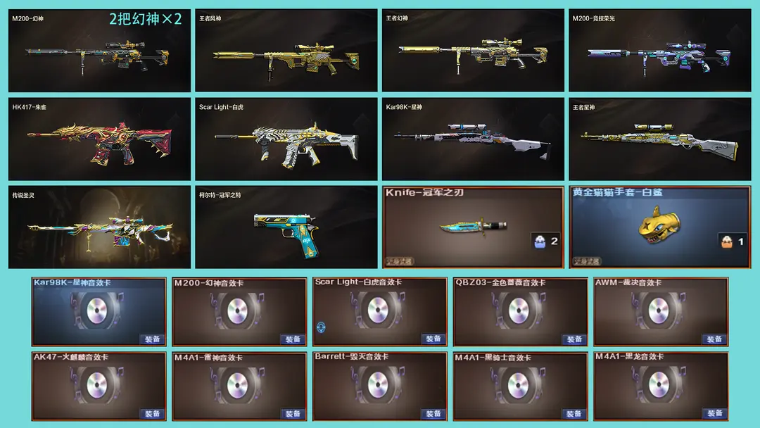 幻神KZCFPLS25冠军,传说圣灵,王者幻神,王者风神,王者星神,幻神冠军之幻,幻神纸灯龙,幻神荣耀世冠白鲨,幻神AGcfplS17冠军,幻神周瑜,幻神黄忠,幻神宠儿2021MVP,幻神巅峰荣耀,幻神cfs2022,QBZ冠军之薇,柯尔特冠军之特,冠军之刃,Kar98K星神音效卡,白虎音效卡,幻神音效卡,QBZ03金色蔷薇音效卡,火麒麟音效卡,裁决音效卡,黑骑士音效卡,黑龙音效卡,毁灭音效卡,全音效卡,朱雀,白虎,玄武,青龙,隼,斯泰尔蝴蝶,qbz03天罚,M4A1幻灵,荣耀世冠雷神,荣耀世冠火麒麟,王者凤吟,白虎之魄,M4A1雷霆王者,M200幻神,M200竞技荣光,Kar98K星神,USP雷暴,柯尔特竞技荣光,荣耀世冠柯尔特,COP357雷霆王者,柯尔特冠军之特,黄金猫猫手套白鲨,冠军之幻冠军之击冠军之怒冠军之心冠军之势冠军之薇冠军之特冠军之刃冠军之魄,荣耀之怒荣耀之魄,电竞教官云悠悠,雷神宠儿2019MVP,传奇石头横秒之巅,雷神传奇N9,毁灭BEAN2020MVP,战神赵云关羽张飞马超,生化满配,挑战满配,爆破全装满配,宗师,大师,传奇,枪王,荣耀枪王,荣耀之巅等等等等