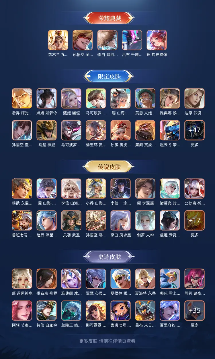 本游戏账号: ,基础段位:至尊星耀I,英雄多,皮肤多。典藏皮肤4个,感受典藏皮肤带来的优质体验快感,FMVP皮肤10个,尽情享受FMVP皮肤带来的主角光环, 私人所属英雄皮肤有:瑶 拾光映像||花木兰 九霄神辉||孙悟空 全息碎影||李白 鸣剑·曳影亚连 落雪白狼||桑启 鸣野蒿||云缨 幻光神枪||艾琳 觅芳踪||澜 电玩·雷克斯||夏洛特 浮生妄||梦奇 胖达荣荣||曜 山海·苍雷引||曜 李逍遥||马超 琥珀纪元||关羽 武圣||露娜 霜月吟||李信 山海·炽霜斩||李信 一念神魔||伽罗 太华||吕布 曦玄引||孙策 乘龙·淬吴钩||孙策 末日机甲||兰陵王 默契交锋||裴擒虎 寅虎·赤拳||貂蝉 曦玄引||貂蝉 仲夏夜之梦||杨戬 永曜之星||马可波罗 妄想实况||公孙离 祈雪灵祝||百里守约 碎云||达摩 黄金狮子座||铠 绛天战甲||王昭君 永恒水手月亮||王昭君 乞巧织情||娜可露露 前尘镜||宫本武藏 惊梅引||宫本武藏 地狱之眼||孙悟空 齐天大圣||孙悟空