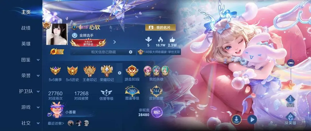账号描述:不禁言女用在榜省金牌瑶大桥朵莉亚少司缘 最新皮肤瑶典藏也买了 745皮+15星传说绿巧黑孔雀,传说123个满 10大无双,库洛米全套天幕+全部无双至尊皮肤+永久四传说灵宝+超多局内动作表情特效+龙年贵族邀请+血条皮肤+典藏小兵皮肤 随游戏更新补齐皮肤按键+超多星史诗+全套KPL比赛史诗星元不确认游戏,消极比赛毁号,涉及毁坏虚拟财产罪及计算机安全罪,请文明游戏素质游戏,让我们共建美好租号平台>>>>>> 本游戏账号: V10荣耀贵族用户,基础段位:最强王者,英雄虽然少,应该有你喜欢的英雄。,皮肤目前不多,希望有你喜欢的。1 注意事项: A.游戏过程中请不要恶意挂机或者不文明发言;B.恶意挂机、顶号等行为将被拉黑无法再次下单;C.进入游戏后中途请勿退出登陆,否则无法再