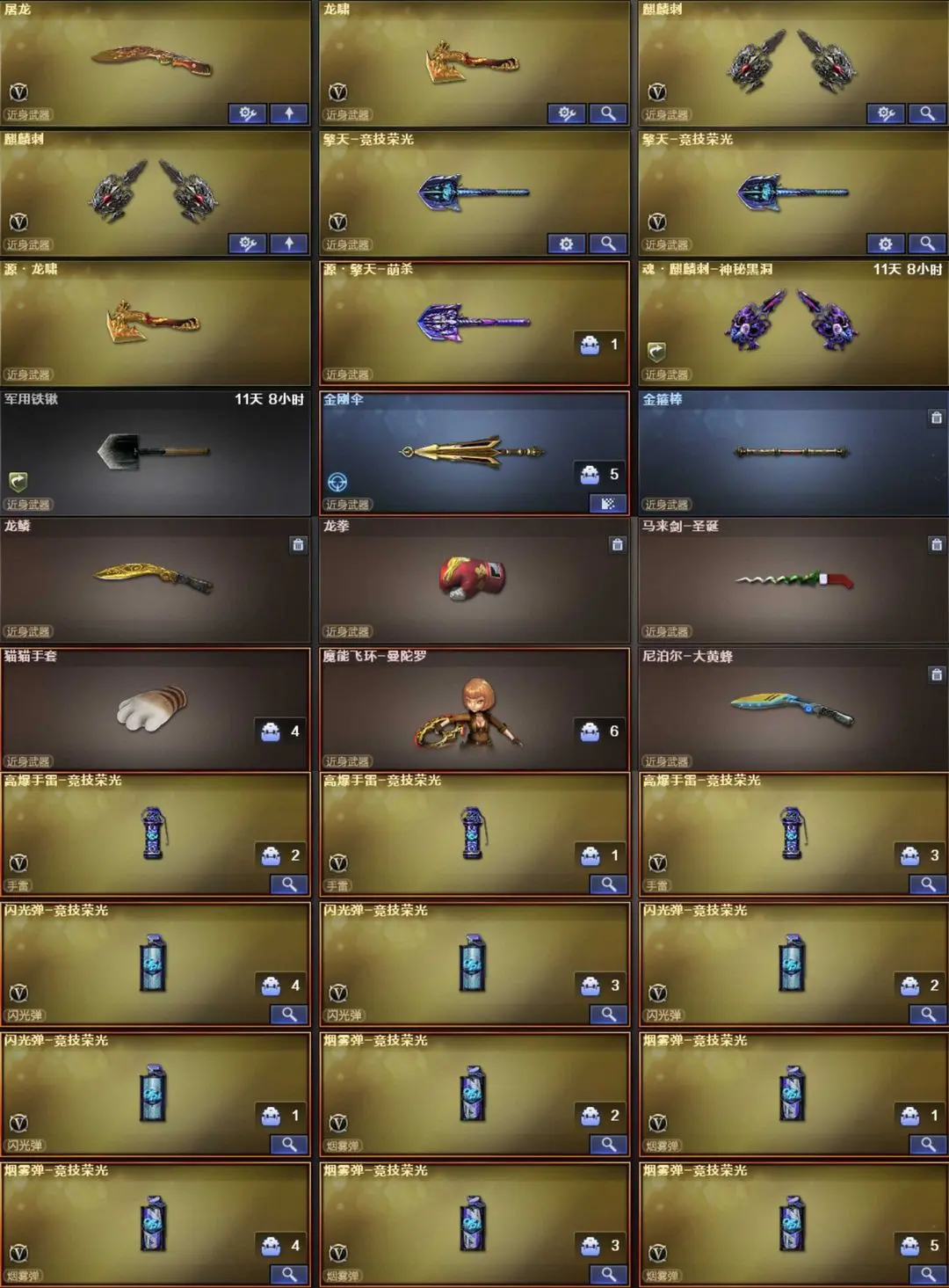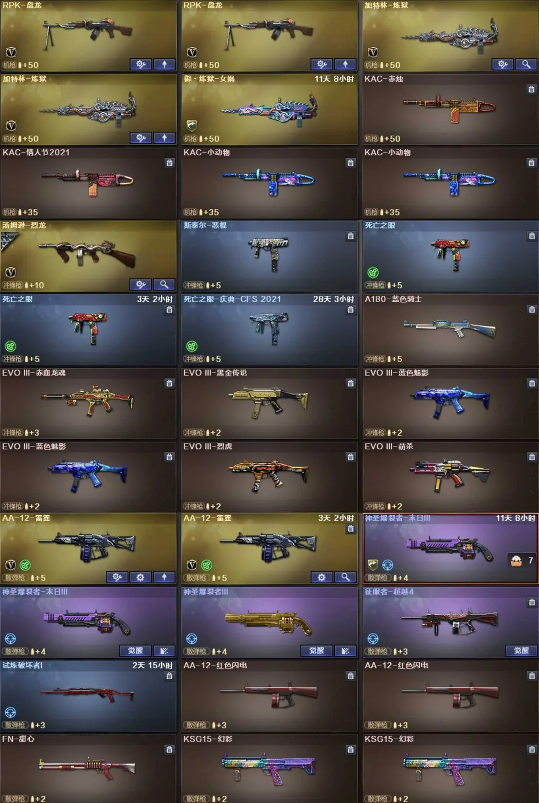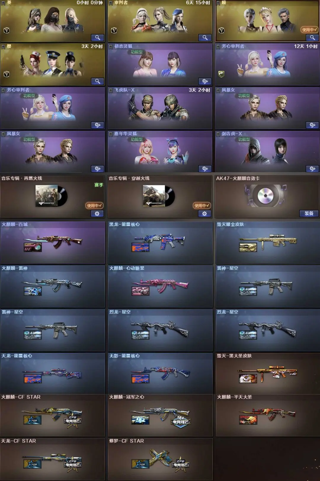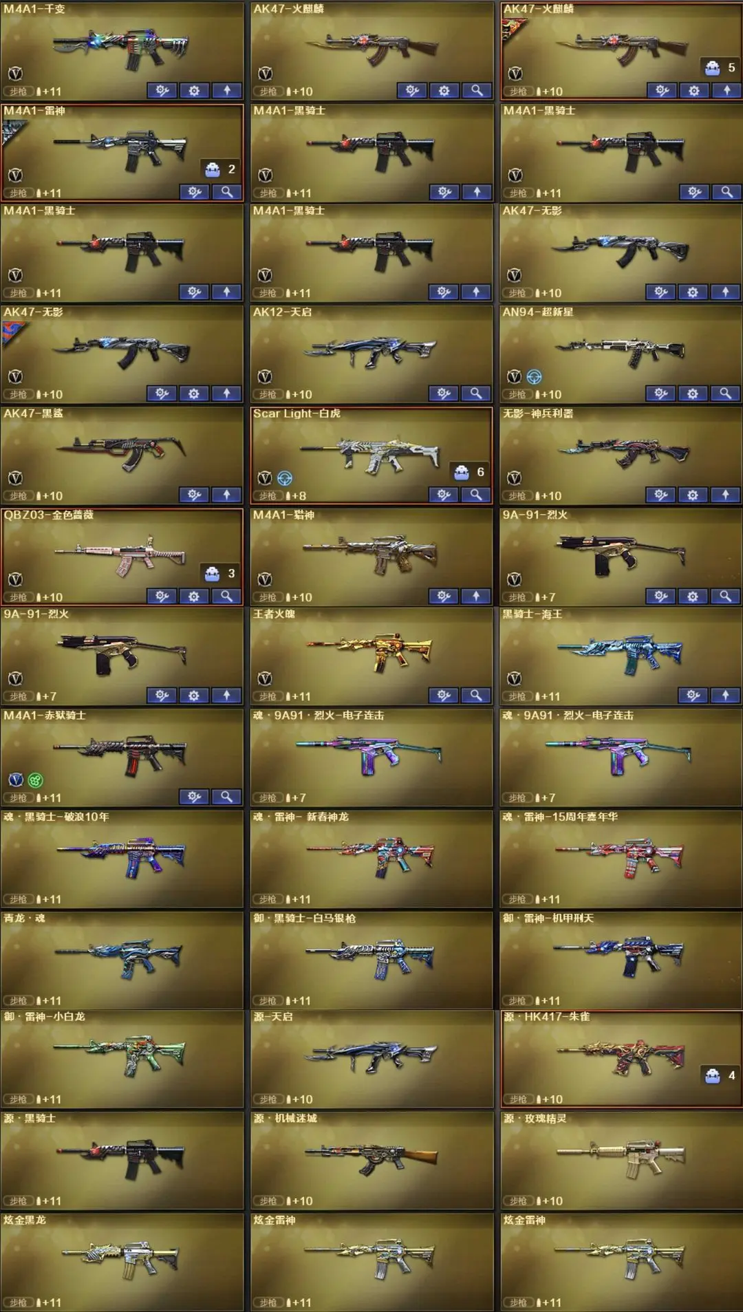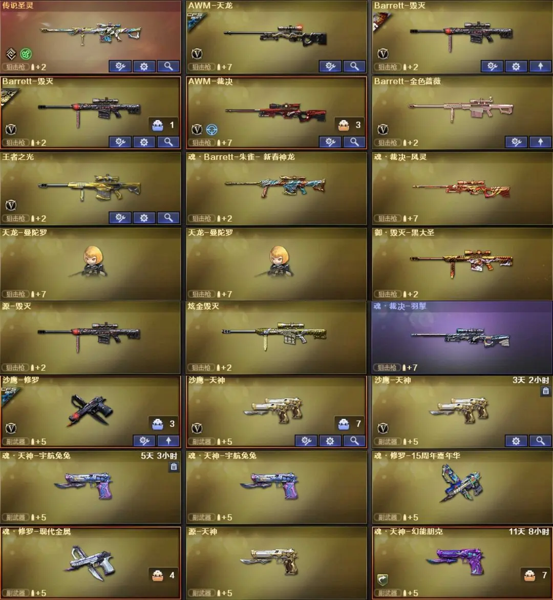 英雄武器53个; 王者武器5个。 可以玩爆破号、生化号、双全装、稀有武器、等模式。特殊装备有:AA-12-雷霆、AK47-火麒麟、竞技荣光烟雾弹闪光弹高爆手雷、擎天竞技荣光、AN94超新星、白虎、传说圣灵、黑骑士海王、加特林炼狱、AWM天龙、QBZ03金色蔷薇、M4A1-黑骑士、毁灭、麒麟刺、M4A1雷神、王者之光觉醒版、炫金黑龙、炫金雷神、炫金毁灭、猫猫手套、枪王之刃、金刚伞、手斧SS、源·玫瑰精灵、源·毁灭、AWMA、死亡之眼-庆典CFS 2021、死亡之眼、AK47A、M4A1S、RPKEmoji、AWMPink、AWMT、G36C宇航兔兔、黄金M14EBR、AK47QT、M82A1-8周年、斯泰尔万圣节2020、黄金AK47、AK47-B-十周年、AK47-破空冰刃、斯泰尔-英特尔、AWM-十周年、斯泰尔-恶棍、M4A1-破空冰刃、AWM-涂鸦、AK47-死亡之翼、M200-涂鸦、Desert Eagle-A、柯尔特-玫瑰、MAC-10-涂鸦、COP 357-青龙、黄金Anaconda、潘多拉、雷霆-β、圣诞潘多拉-X、生化弹匣、AK47-火麒麟音效卡
