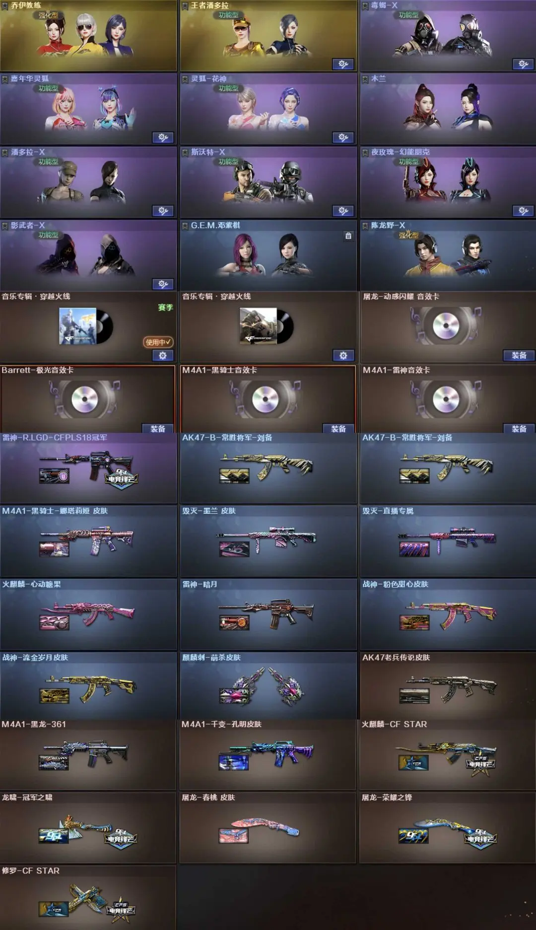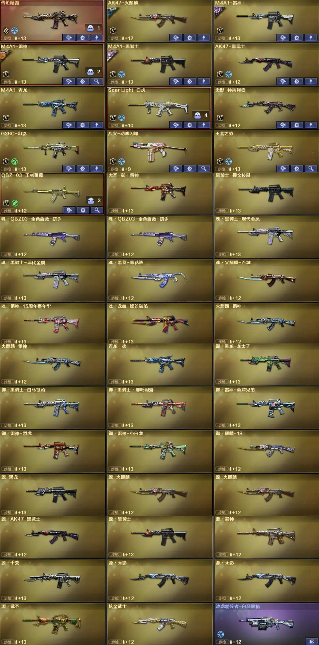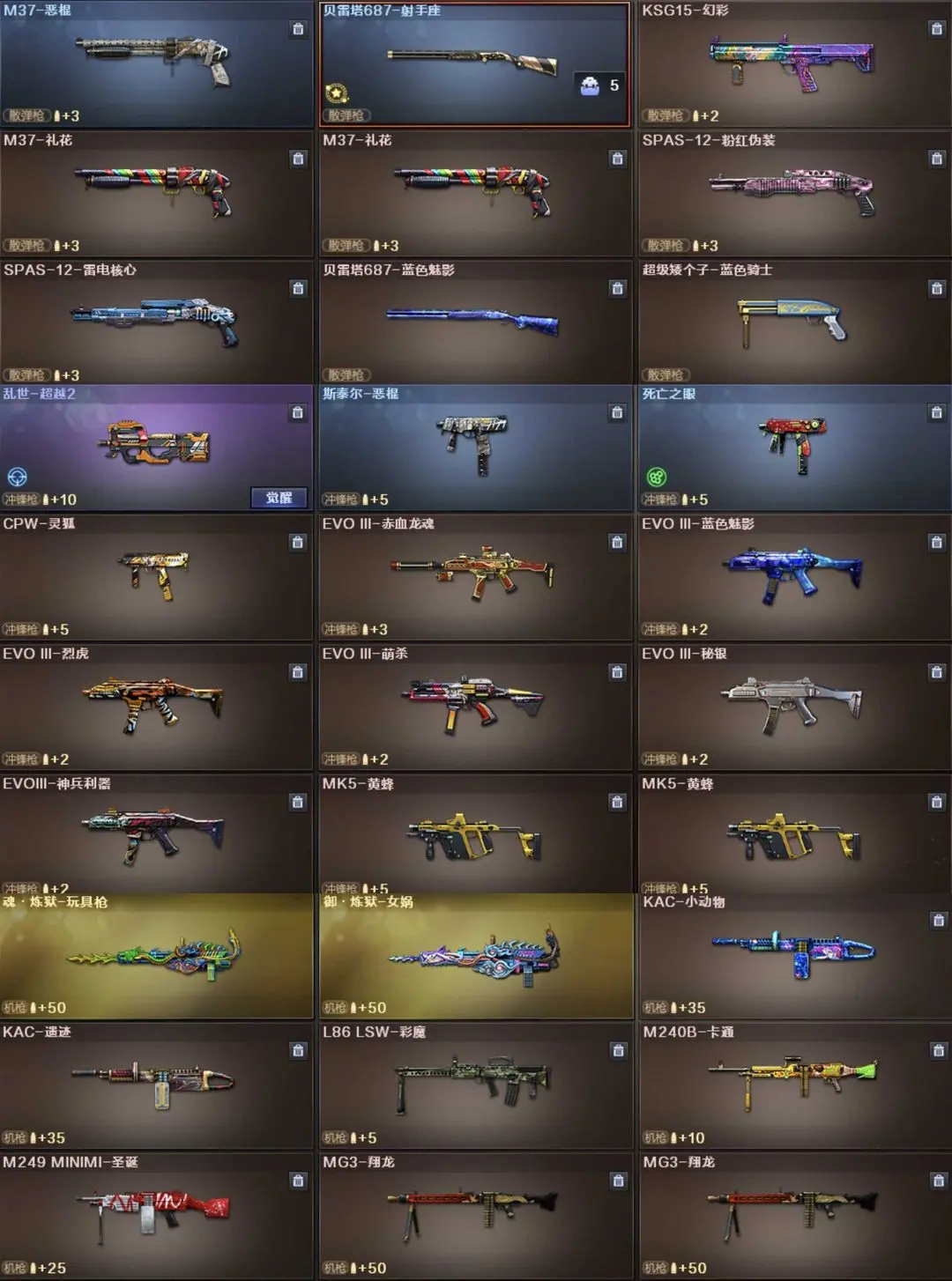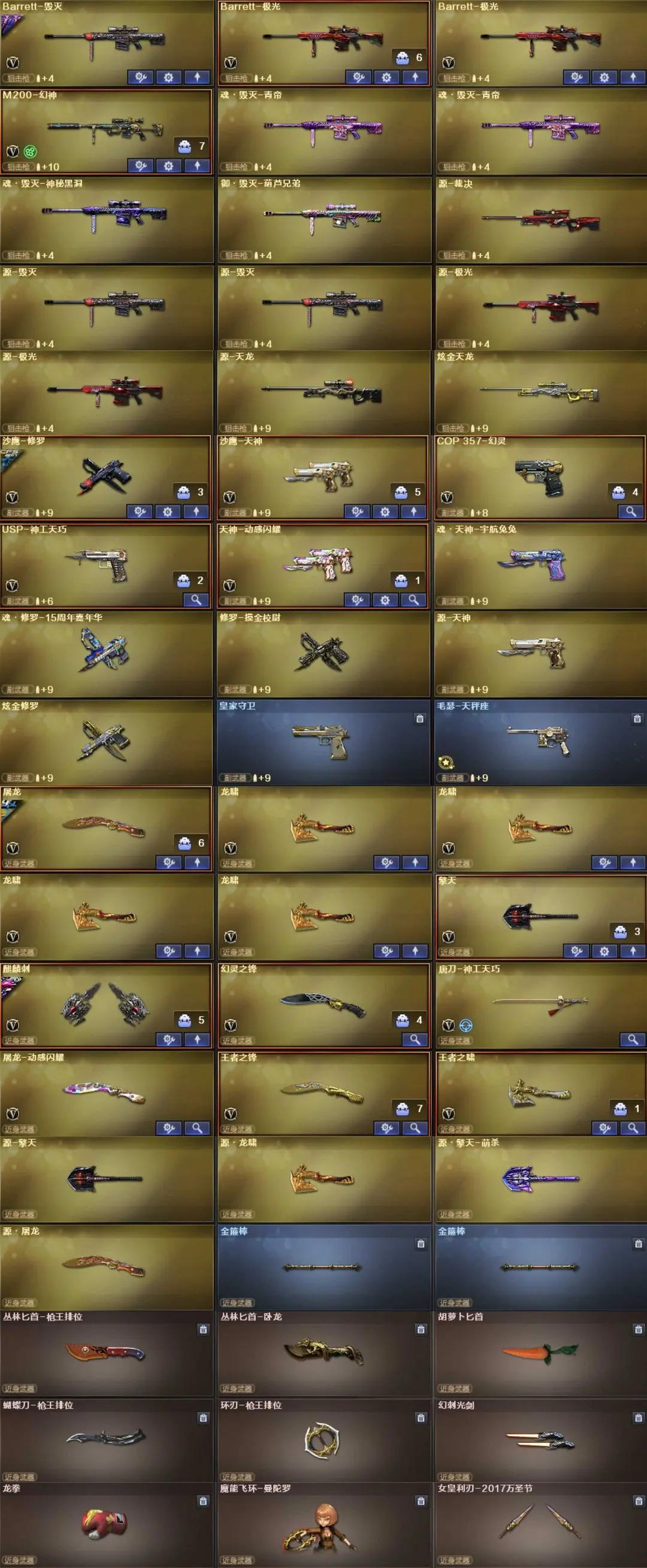 英雄武器127个; 王者武器13个。 可以玩爆破号、生化号、双全装、稀有武器、等模式。装备齐全拥有完美游戏体验。重要的是,特殊装备有:神工天巧全套、竞技荣光套、幻灵套、毁灭、AN超新星、USP雷暴、黑骑士、雷神、火麒麟、AWM天龙、传说圣谕、雷霆之锋、麒麟刺、HK朱雀、星神、白虎、幻神、加特林炼狱、黑武士、黑龙、QBZ03蔷薇、玄武、炼狱悦蓝觉醒、炫金雷神、炫金骑士、王锋觉醒、QBZ03王者蔷薇觉醒、王者冰锋、王武觉醒、王魄觉醒、黄金猫猫手套白鲨、冠军之刃、金刚伞、魂·QBZ03金蔷薇蛇姬、G36C宇航兔兔、黑武士渊龙、斯泰尔恶棍、C.A.T、魂·QBZ03金色蔷薇萌杀、斯泰尔万圣节2020、加特林炼狱掌火、斯泰尔蝴蝶、斯泰尔正义、金色蔷薇空、斯泰尔墨兰、COP白鲨、COP35、柯尔特涂鸦、PMR30、王者炽天使、王者魅影、魅影、堕天使、王者葵貂蝉、圣诞潘多拉X、潘多拉、碧霄极光-白虎-幻神-极光-QBZ蔷薇-QBZ天罚-黑龙-黑骑士-炼狱-火麒麟-毁灭-烈火音效