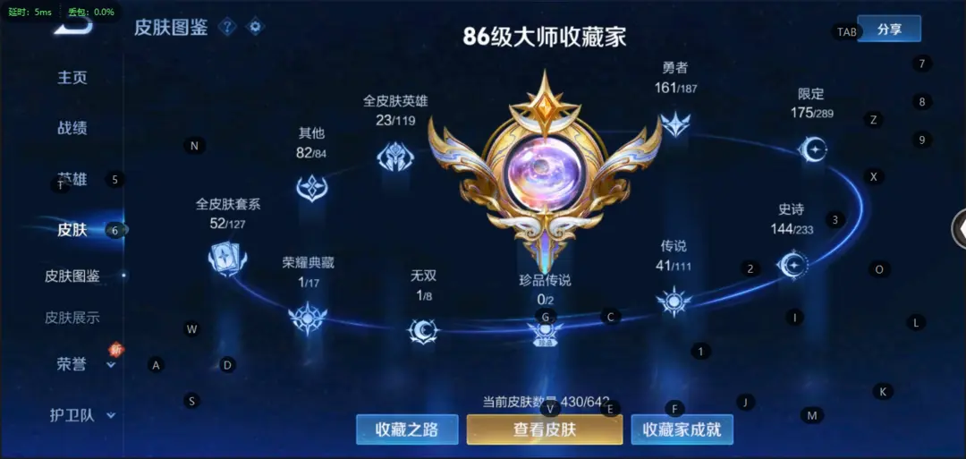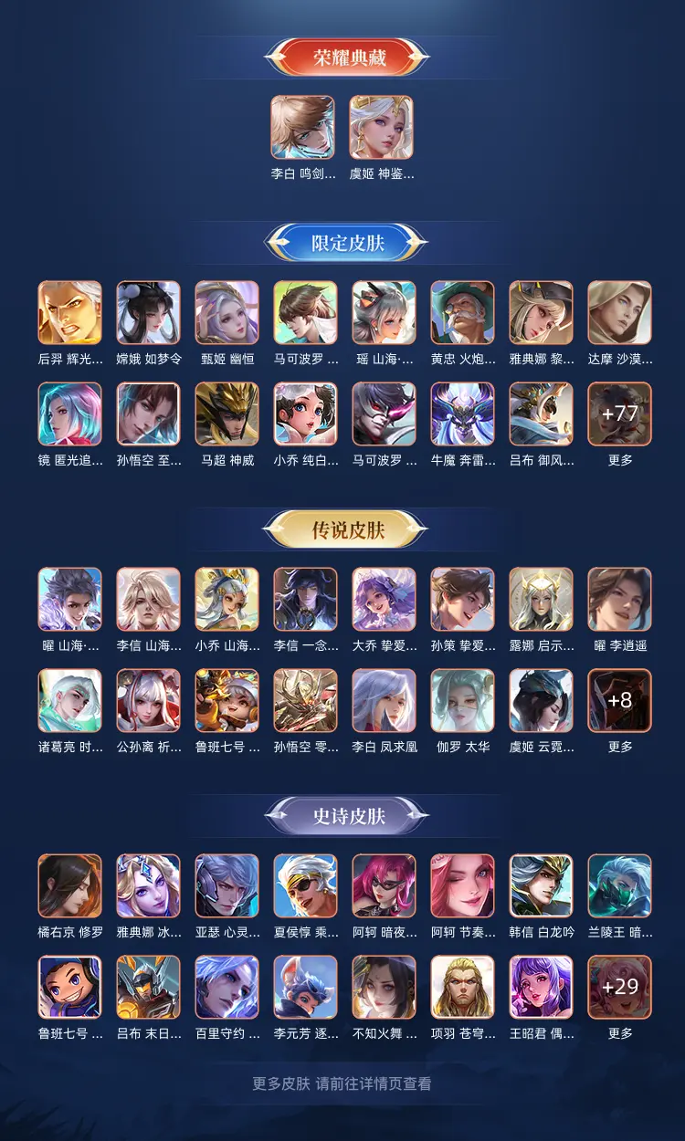 【皮肤】:鸣剑·曳影/碎月剑心/觅芳踪/琥珀纪元/琥珀纪元/音你心动/逐花归海/霜月吟/百相守梦/燃星之曲/山海·琳琅生/山海·苍雷引/山海·炽霜斩/诗剑行/绯月行/无双飞将/挚爱花嫁/挚爱之约/武陵仙君/启示之音/寅虎·瑞焰/寅虎·赤拳/仲夏夜之梦/李逍遥 /时之恋人/黄金白羊座/祈雪灵祝/时雨天司/绛天战甲/炽阳神光/启明星使/零号·赤焰/云鹰飞将/一念神魔/太华/凤求凰/猫影幻舞/久胜战神/云霓雀翎/白虎志/冠军飞将/末日机甲/地狱之眼/妄想食味/琥珀纪元/诗语江南/幽恒/荣光圣徽/雪夜绮愿/百解令/地狱燃心/绅士熊喵/江河有灵/驭风魔法/电玩·爆裂旋风/奇幻香踪/百相守梦/百相守梦/擒涛扼浪/猫