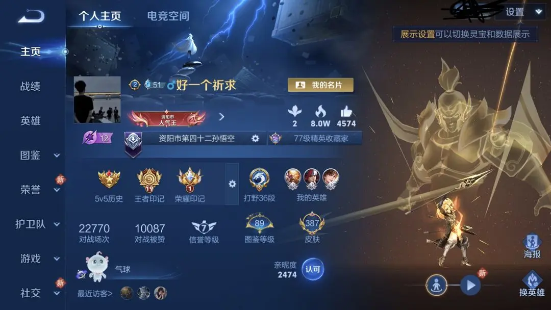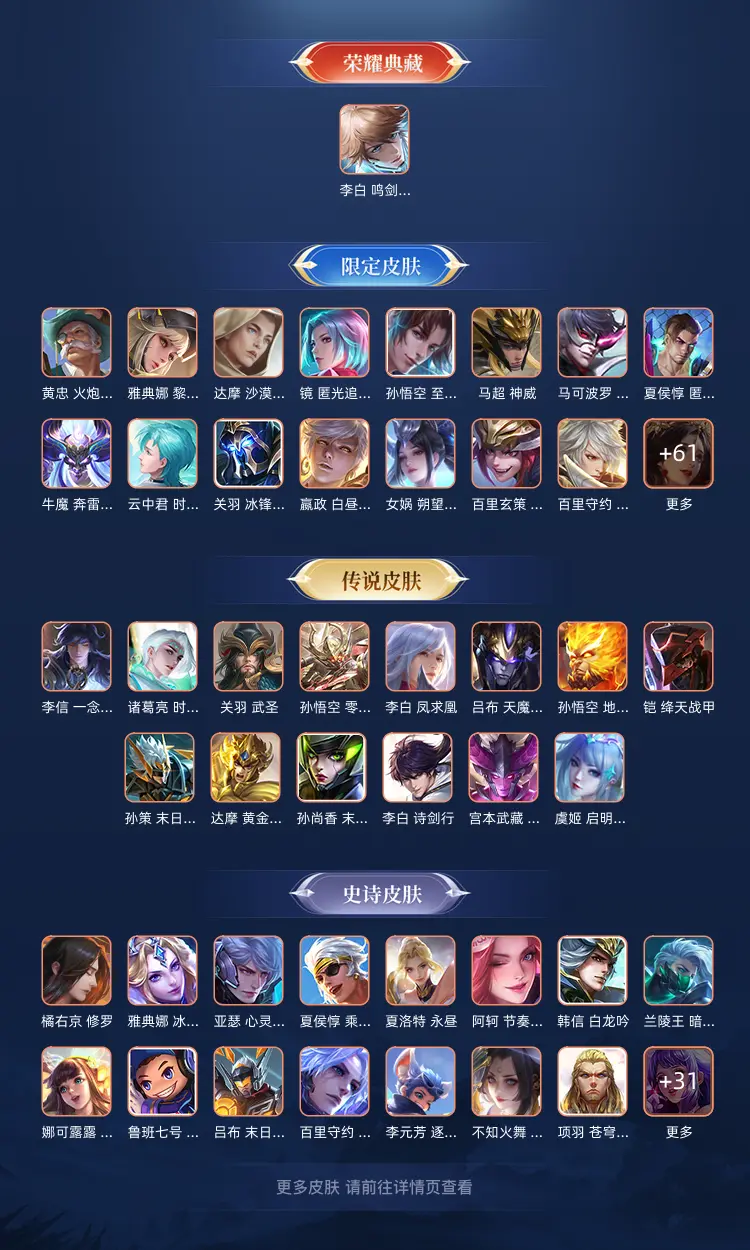 本游戏账号: V10用户,基础段位:最强王者,英雄多,皮肤多。典藏皮肤1个,感受典藏皮肤带来的优质体验快感,FMVP皮肤2个,尽情享受FMVP皮肤带来的主角光环, 私人所属英雄皮肤有:李白 鸣剑·曳影诸葛亮 时雨天司||铠 绛天战甲||孙尚香 末日机甲||孙策 末日机甲||吕布 天魔缭乱||宫本武藏 地狱之眼||李白 诗剑行||李白 凤求凰||达摩 黄金狮子座||关羽 武圣||艾琳 觅芳踪||孙悟空 齐天大圣||孙悟空 零号·赤焰||孙悟空 地狱火||虞姬 启明星使||李信 一念神魔,等等