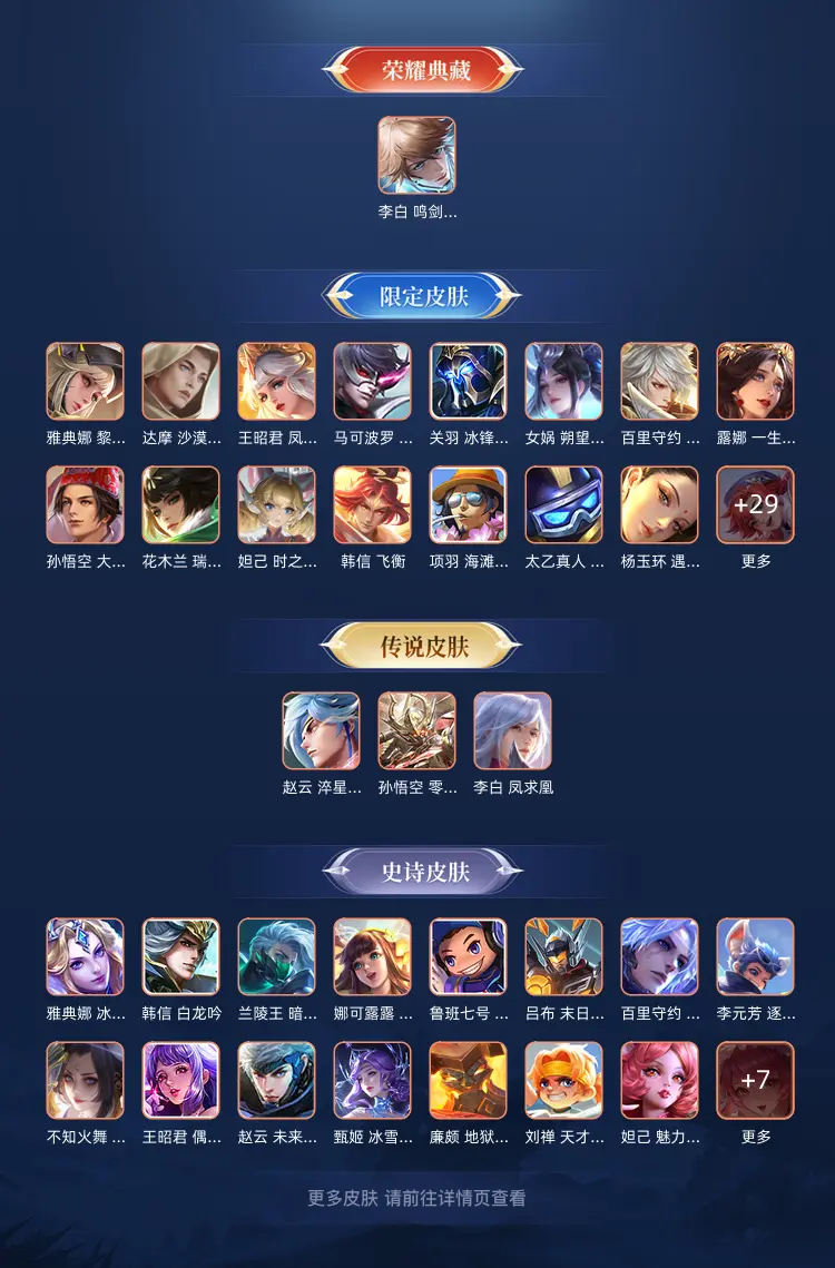 本游戏账号: ,基础段位:至尊星耀V,英雄多,皮肤多。典藏皮肤1个,感受典藏皮肤带来的优质体验快感,FMVP皮肤1个,尽情享受FMVP皮肤带来的主角光环, 私人所属英雄皮肤有:李白 鸣剑·曳影李白 凤求凰||孙悟空 零号·赤焰||赵云 淬星耀世花木兰 冠军飞将百里守约 朱雀志||鲁班七号 狮舞东方||庄周 高山流水||阿轲 迷踪丽影||上官婉儿 天狼绘梦者||上官婉儿 梁祝||嫦娥 拒霜思||元歌 云间偶戏||甄姬 游园惊梦||蒙犽 狂想玩偶喵||典韦 蓝屏警告||马可波罗 暗影游猎||狄仁杰 魔术师||狄仁杰 阴阳师||达摩 沙漠行僧||项羽 海滩派对||阿古朵 江河有灵||桑启 海盐诗旅||关羽 冰锋战神||安琪拉 魔法小厨娘||安琪拉 如懿||露娜 一生所爱||刘邦 夺宝奇兵||韩信 飞衡||王昭君 凤凰于飞||兰陵王 驯魔猎人||花木兰 瑞麟志||艾琳 女武神||亚瑟 潮玩骑士王||孙悟空 大圣娶亲||李元芳 银河之约||钟馗 神迹守卫||杨玉环 遇见飞天||女娲 朔望之