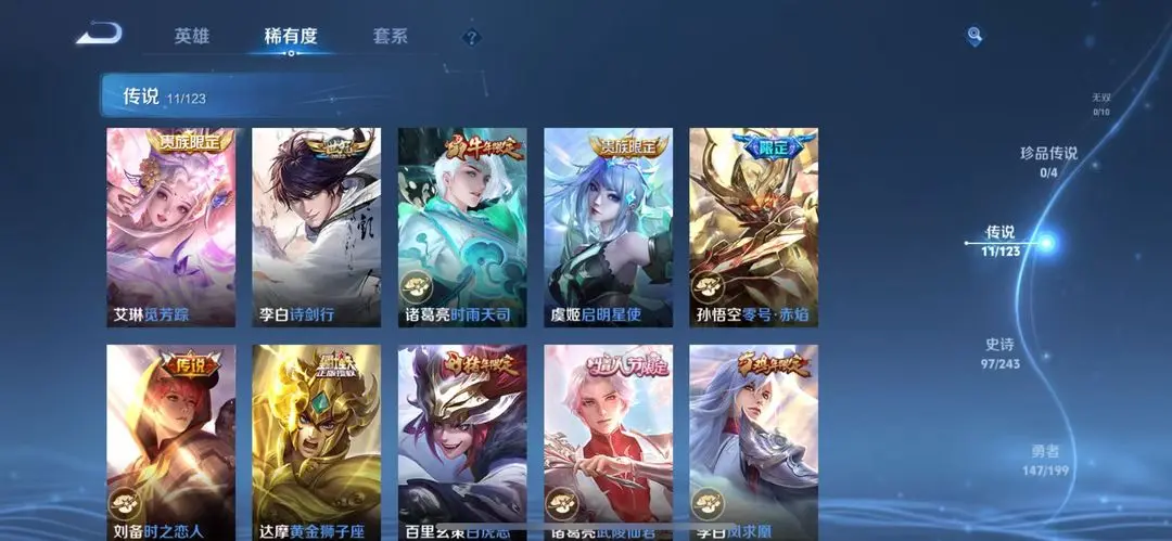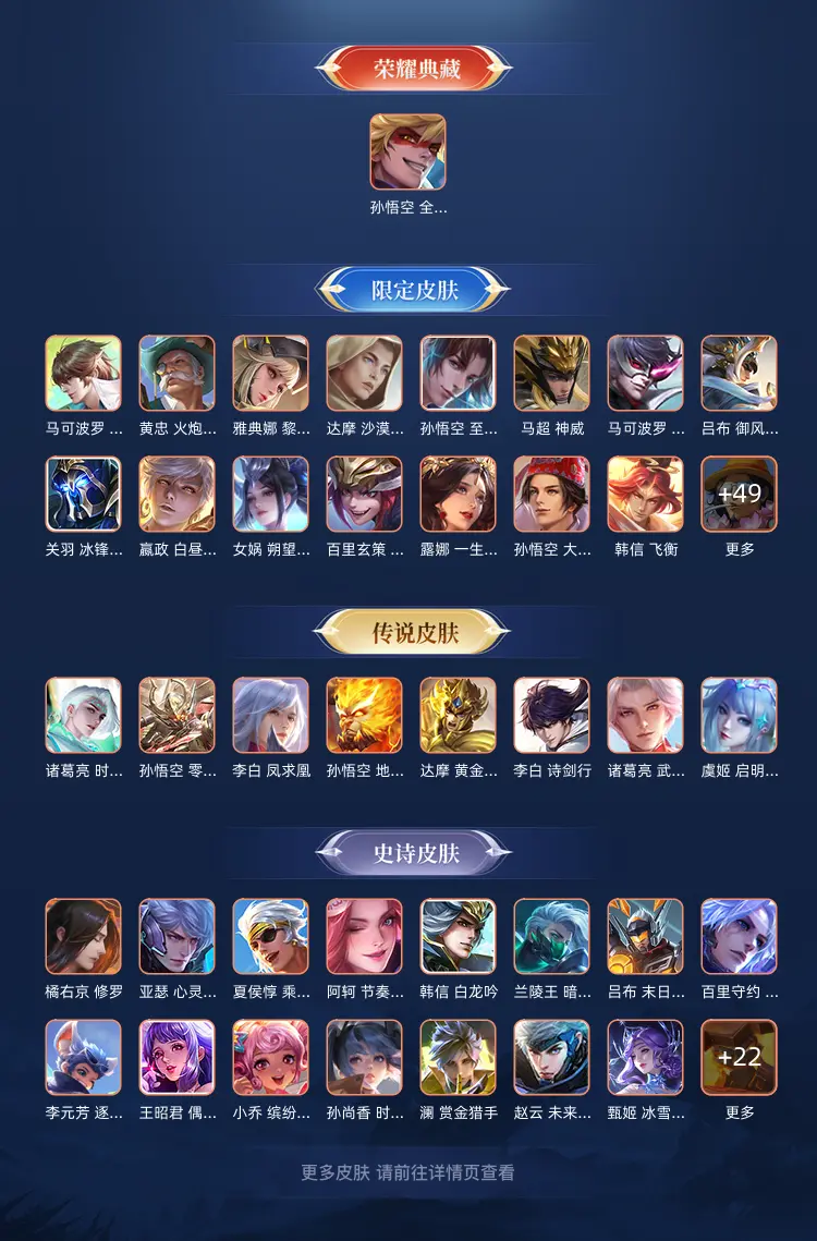 本游戏账号: V10用户,基础段位:英雄多,皮肤多。典藏皮肤1个,感受典藏皮肤带来的优质体验快感, 私人所属英雄皮肤有:孙悟空 全息碎影诸葛亮 时雨天司||诸葛亮 武陵仙君||李白 诗剑行||李白 凤求凰||达摩 黄金狮子座||艾琳 觅芳踪||孙悟空 地狱火||孙悟空 零号·赤焰||虞姬 启明星使,等等