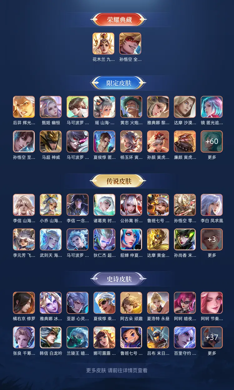 本游戏账号: V10用户,基础段位:最强王者,英雄多,皮肤多。典藏皮肤2个,感受典藏皮肤带来的优质体验快感,FMVP皮肤3个,尽情享受FMVP皮肤带来的主角光环, 私人所属英雄皮肤有:花木兰 九霄神辉||孙悟空 全息碎影诸葛亮 时雨天司||诸葛亮 武陵仙君||孙尚香 末日机甲||公孙离 祈雪灵祝||公孙离 记忆之芯||鲁班七号 寅虎·瑞焰||宫本武藏 地狱之眼||李白 凤求凰||马可波罗 深海之息||狄仁杰 超时空战士||达摩 黄金狮子座||项羽 无限倾心||武则天 海洋之心||夏洛特 浮生妄||貂蝉 仲夏夜之梦||王昭君 乞巧织情||花木兰 燃星之曲||艾琳 觅芳踪||孙悟空 零号·赤焰||孙悟空 齐天大圣||张飞 百相守梦||李元芳 飞鸢探春||虞姬 无限倾心||虞姬 启明星使||小乔 山海·琳琅生||李信 山海·炽霜斩||李信 一念神魔,等等