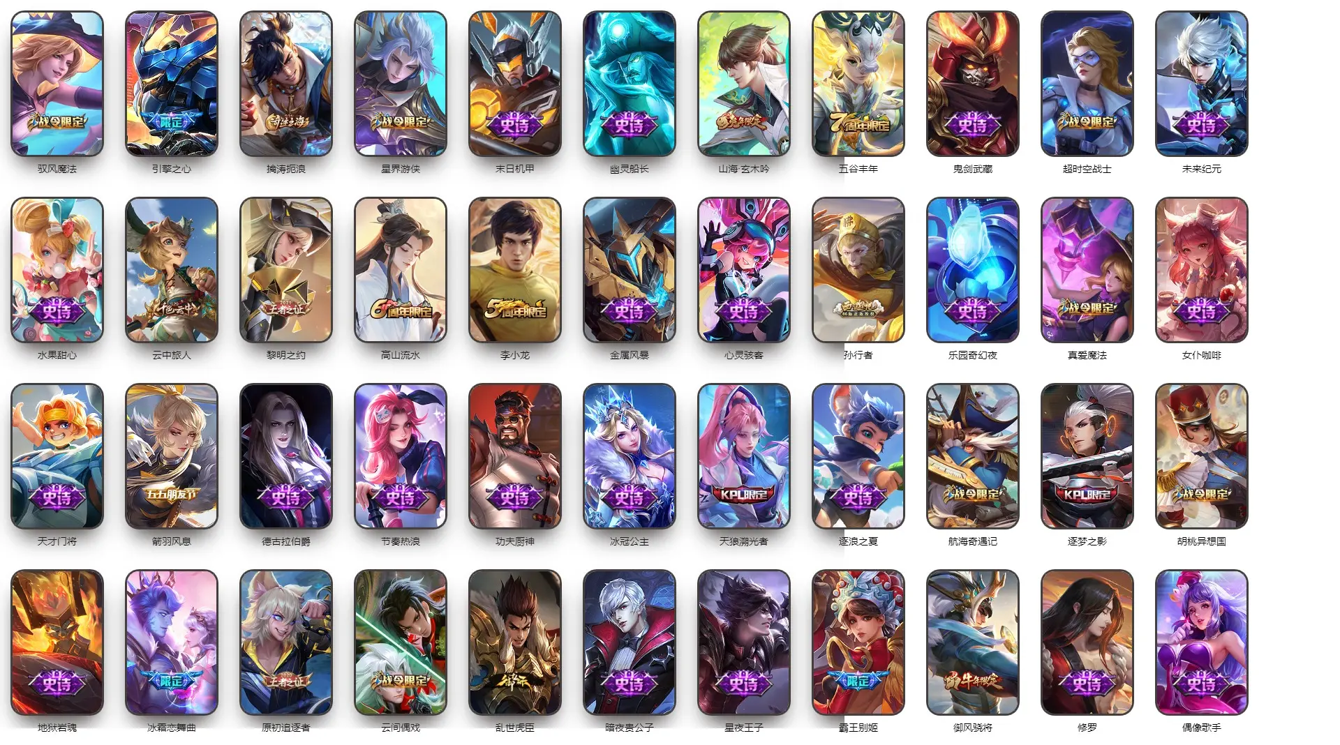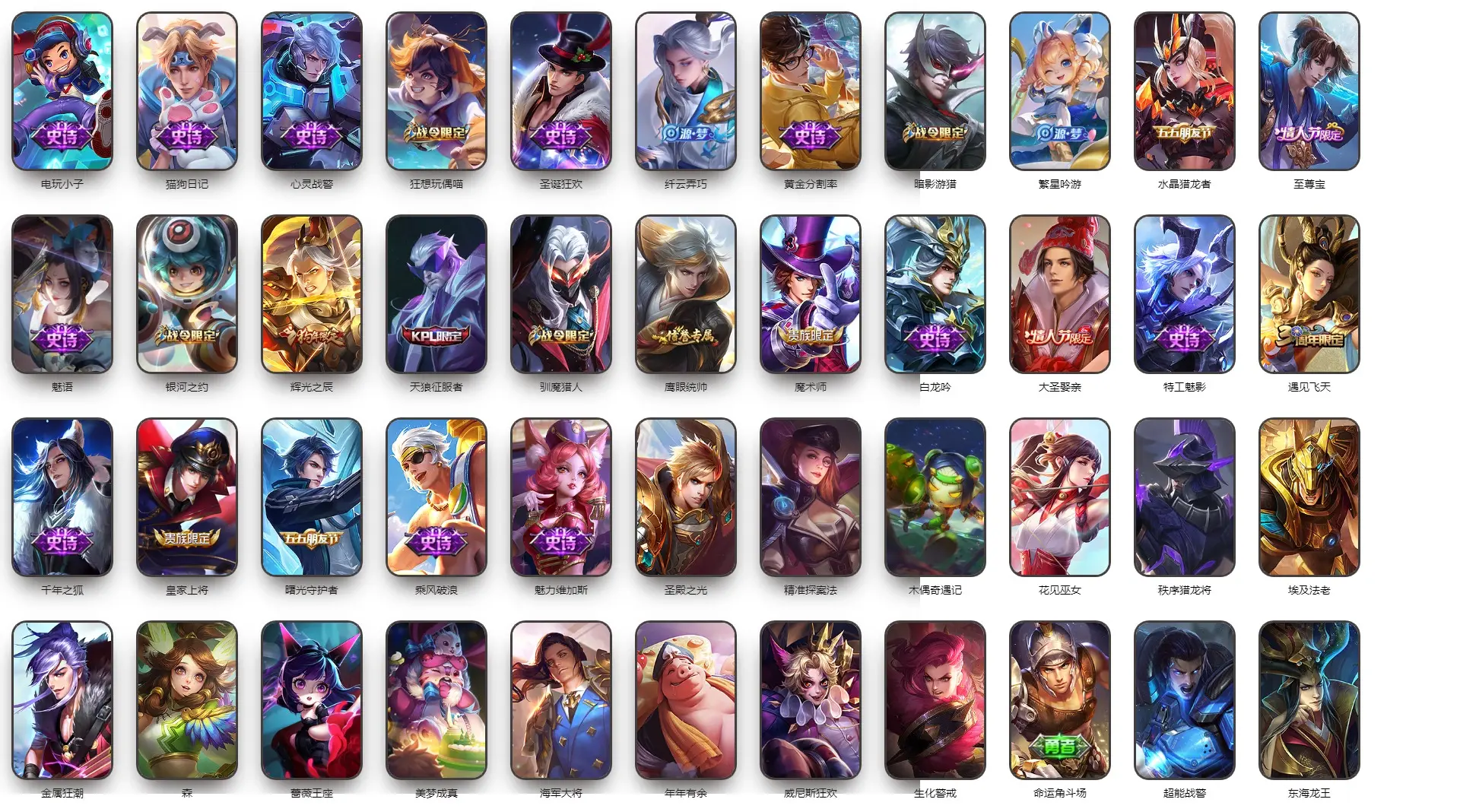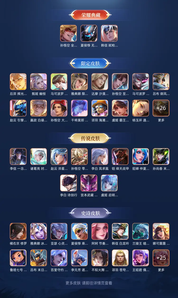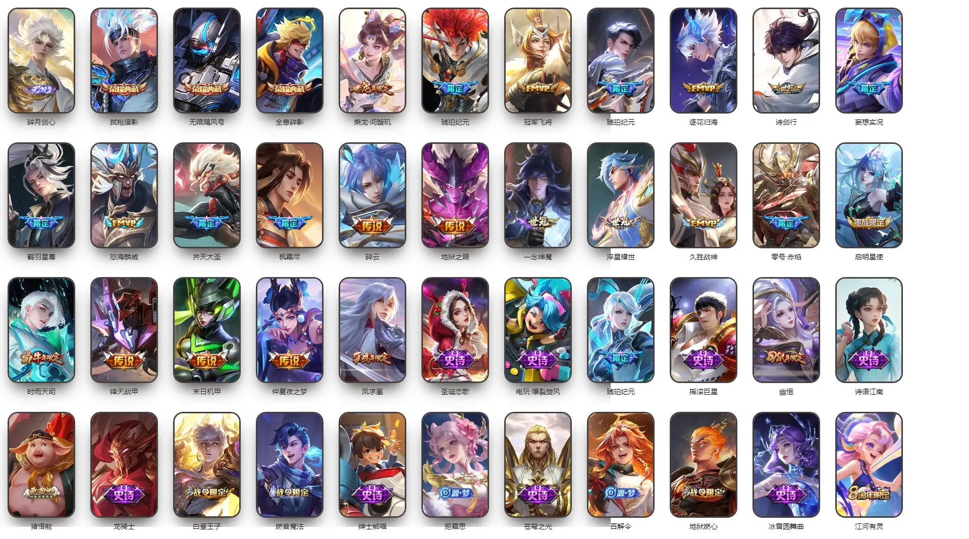 【皮肤】:弑枪猎影/无限飓风号/全息碎影/碎月剑心/乘龙·问璇玑/琥珀纪元/冠军飞将/琥珀纪元/逐花归海/诗剑行/妄想实况/鹤羽星尊/怒海麟威/齐天大圣/枫霜尽/碎云/地狱之眼/一念神魔/淬星耀世/久胜战神/零号·赤焰/启明星使/时雨天司/绛天战甲/末日机甲/仲夏夜之梦/凤求凰/圣诞恋歌/电玩·爆裂旋风/琥珀纪元/摇滚巨星/幽恒/诗语江南/猪悟能/龙骑士/白昼王子/燃音魔法/绅士熊喵/拒霜思/苍穹之光/百解令/地狱燃心/冰雪圆舞曲/江河有灵/驭风魔法/引擎之心/擒涛扼浪/星界游侠/末日机甲/幽灵船长/山海·玄木吟/五谷丰年/鬼剑武藏/超时空战士/未来纪元/水果甜心/云中旅人/黎明之约/高山流水/李小龙/