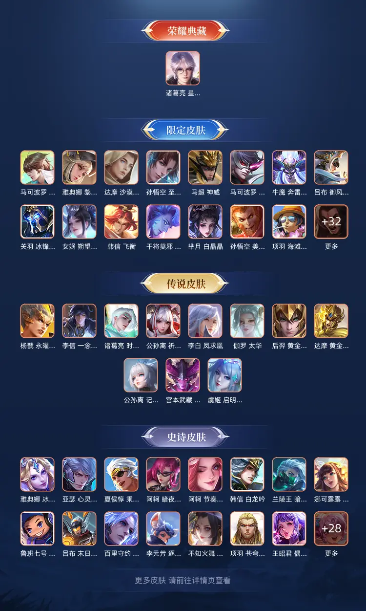 本游戏账号: V8用户,基础段位:最强王者,英雄多,皮肤多。典藏皮肤1个,感受典藏皮肤带来的优质体验快感,FMVP皮肤3个,尽情享受FMVP皮肤带来的主角光环, 私人所属英雄皮肤有:诸葛亮 星域神启诸葛亮 时雨天司||公孙离 记忆之芯||公孙离 祈雪灵祝||宫本武藏 地狱之眼||李白 凤求凰||达摩 黄金狮子座||后羿 黄金射手座||虞姬 启明星使||杨戬 永曜之星||李信 一念神魔||伽罗 太华,等等