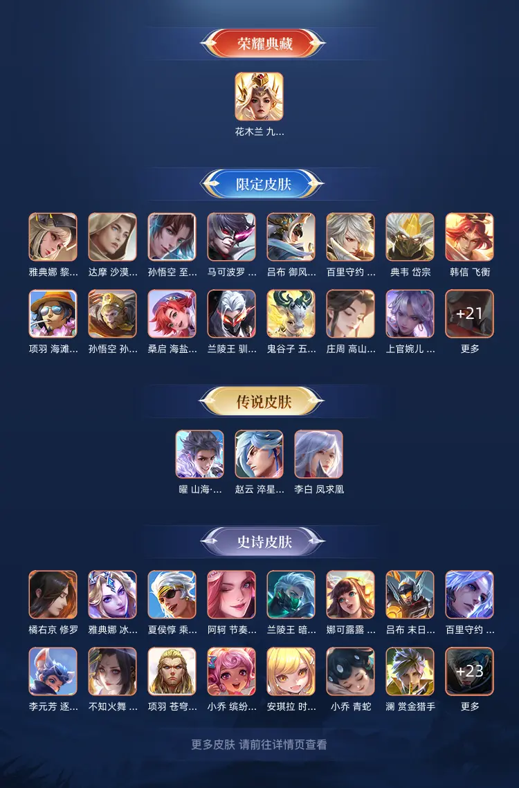本游戏账号: V7用户,基础段位:至尊星耀V,英雄多,皮肤多。典藏皮肤1个,感受典藏皮肤带来的优质体验快感,FMVP皮肤2个,尽情享受FMVP皮肤带来的主角光环, 私人所属英雄皮肤有:花木兰 九霄神辉曜 山海·苍雷引||李白 凤求凰||赵云 淬星耀世马超 无双飞将||吕布 怒海麟威百里守约 朱雀志||庄周 高山流水||刘禅 唤灵魔甲||上官婉儿 天狼绘梦者||上官婉儿 梁祝||钟无艳 超时空战士||嫦娥 拒霜思||吕布 御风骁将||元歌 云间偶戏||夏侯惇 霜北刀||甄姬 落雪兰心||西施 玲珑珍味||曹操 天狼征服者||蒙犽 狂想玩偶喵||典韦 岱宗||鲁班大师 乓乓大师||马可波罗 暗影游猎||狄仁杰 魔术师||狄仁杰 阴阳师||达摩 沙漠行僧||项羽 海滩派对||阿古朵 江河有灵||桑启 海盐诗旅||司空震 地狱燃心||暃 埋骨钱||戈娅 驭风魔法||韩信 飞衡||兰陵王 驯魔猎人||艾琳 流音漫舞||亚瑟 潮玩骑士王||孙悟空 孙行者||孙悟空 至尊宝||后羿 圣弓游侠|