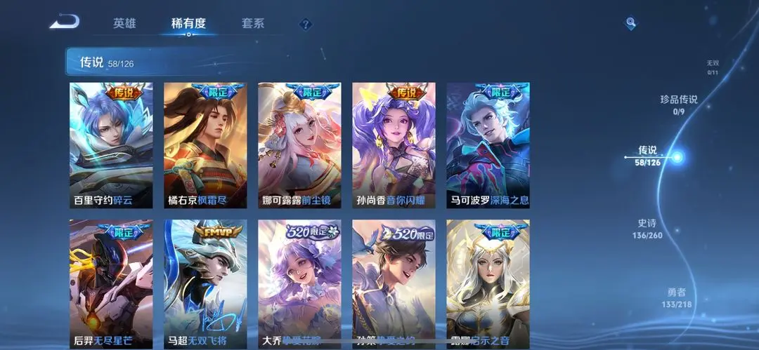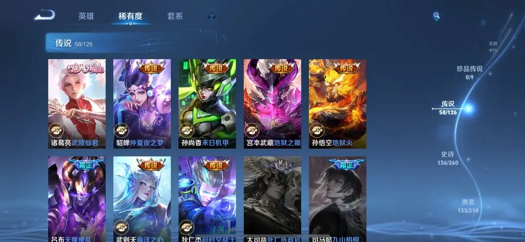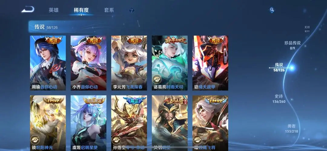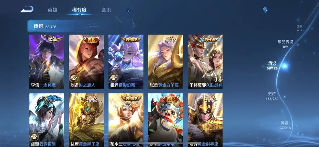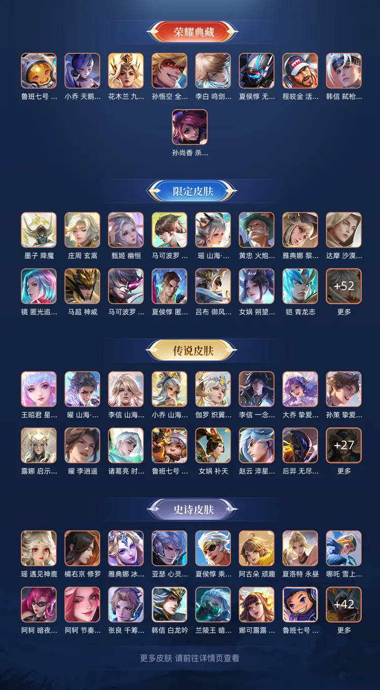 本游戏账号: V10用户,基础段位:最强王者,英雄多,皮肤多。典藏皮肤9个,感受典藏皮肤带来的优质体验快感,FMVP皮肤7个,尽情享受FMVP皮肤带来的主角光环, 私人所属英雄皮肤有:孙尚香 杀手不太冷||鲁班七号 星空梦想||夏侯惇 无限飓风号||李白 鸣剑·曳影||程咬金 活力突击||韩信 弑枪猎影||花木兰 九霄神辉||孙悟空 全息碎影||小乔 天鹅之梦,等等