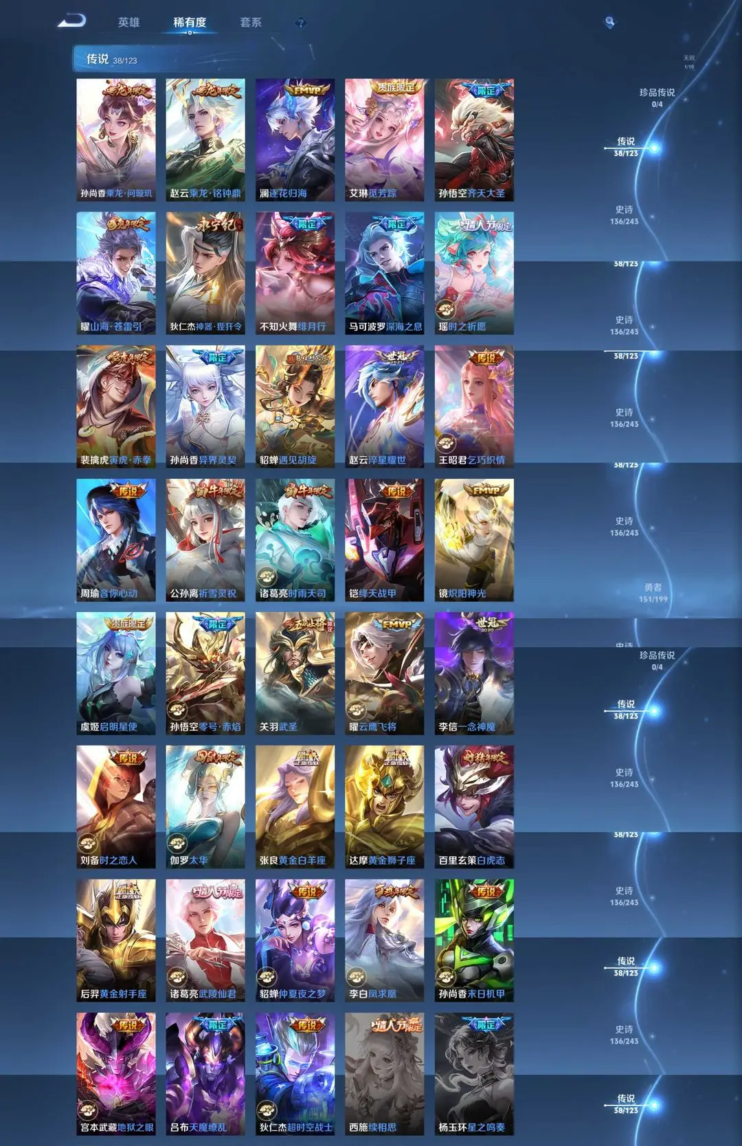 本游戏账号: V10用户,基础段位:至尊星耀I,英雄多,皮肤多。典藏皮肤3个,感受典藏皮肤带来的优质体验快感,FMVP皮肤3个,尽情享受FMVP皮肤带来的主角光环, 私人所属英雄皮肤有:诸葛亮 星域神启||鲁班七号 星空梦想||夏侯惇 无限飓风号诸葛亮 时雨天司||诸葛亮 武陵仙君||铠 绛天战甲||孙尚香 乘龙·问璇玑||孙尚香 异界灵契||孙尚香 末日机甲||公孙离 祈雪灵祝||吕布 天魔缭乱||周瑜 音你心动||曜 山海·苍雷引||宫本武藏 地狱之眼||李白 凤求凰||马可波罗 深海之息||狄仁杰 神器·狴犴令||狄仁杰 超时空战士||达摩 黄金狮子座||关羽 武圣||貂蝉 仲夏夜之梦||貂蝉 遇见胡旋||王昭君 乞巧织情||艾琳 觅芳踪||张良 黄金白羊座||不知火舞 绯月行||孙悟空 齐天大圣||孙悟空 零号·赤焰||后羿 黄金射手座||虞姬 启明星使||裴擒虎 寅虎·赤拳||赵云 乘龙·铭钟鼎||赵云 淬星耀世||瑶 时之祈愿||李信 一念神魔||伽罗 太华,等等