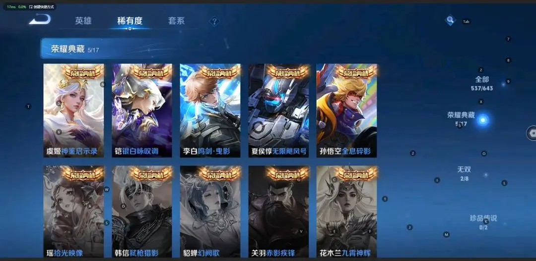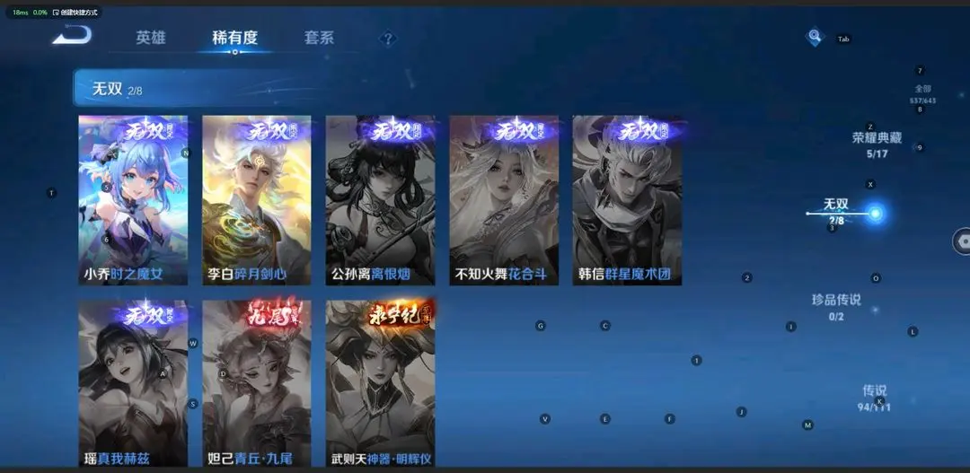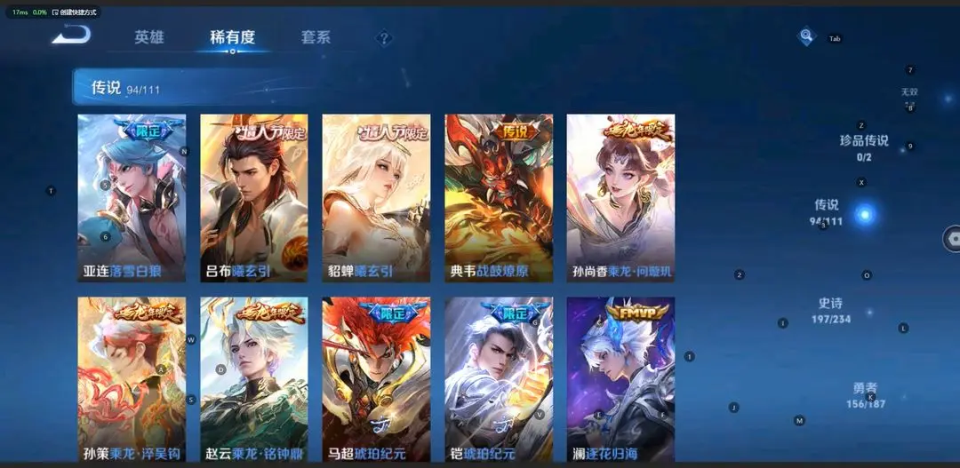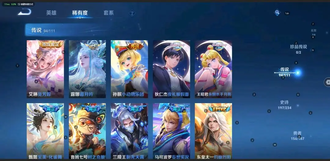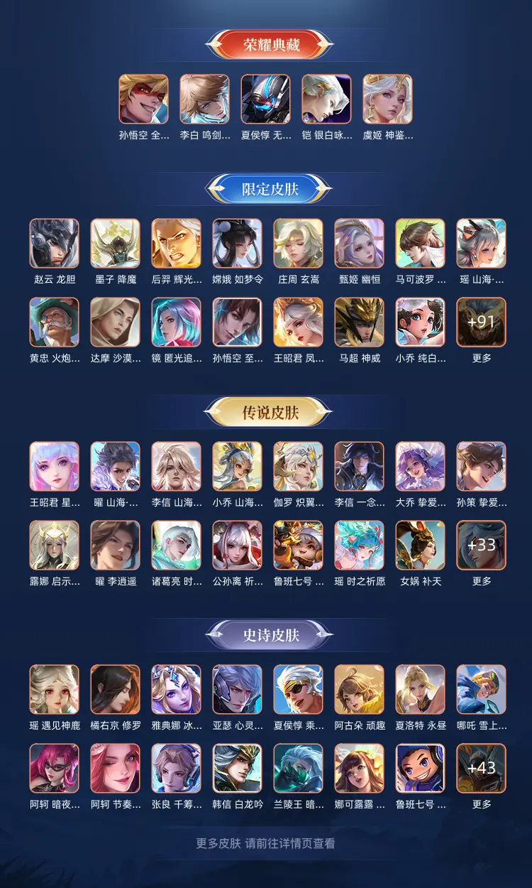 英雄:孙悟空;太乙真人;王昭君;海月;武则天;赵怀真;夏侯惇;莱西奥;项羽;小乔;雅典娜;亚瑟;杨戬;杨玉环;弈星;嬴政;虞姬;张飞;张良;赵云;金蝉;甄姬;钟馗;钟无艳;周瑜;蒙恬;诸葛亮;庄周;艾琳;姬小满;亚连;暃;云缨;米莱狄;沈梦溪;戈娅;司马懿;敖隐;李信;狂铁;鲁班大师;桑启;蒙犽;朵莉亚;大司命;元歌;夏洛特;阿古朵;曜;上官婉儿;马超;西施;嫦娥;海诺;猪八戒;影;少司缘;盾山;百里守约;盘古;阿轲;安琪拉;白起;百里玄策;扁鹊;不知火舞;蔡文姬;曹操;成吉思汗;程咬金;达摩;妲己;大乔;狄仁杰;典韦;貂蝉;东皇太一;孙策;干将莫邪;高渐离;公孙离;宫本武藏;关羽;鬼谷子;韩信;司空震;后羿;花木兰;黄忠;姜子牙;橘右京;铠;兰陵王;瑶;澜;老夫子;云中君;李白;李元芳;廉颇;刘邦;刘备;刘禅;鲁班七号;露娜;吕布;马可波罗;梦奇;芈月;明世隐;墨子;哪吒;镜;娜可露露;