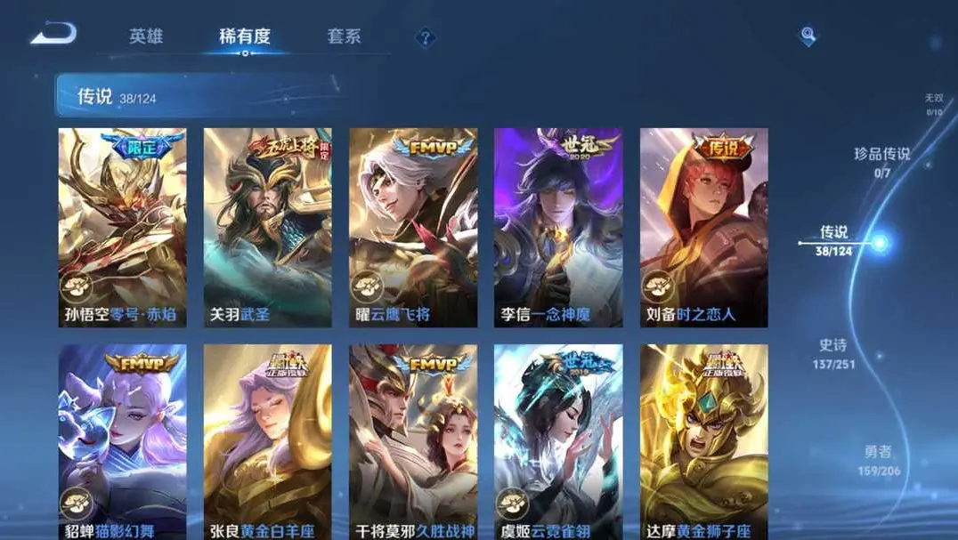 孙悟空(孙悟空 齐天大圣,孙悟空 孙行者,孙悟空 零号·赤焰,孙悟空 至尊宝,孙悟空 大圣娶亲,孙悟空 西部大镖客,区标);韩信(韩信 弑枪猎影,韩信 教廷特使,韩信 傲雪梅枪,韩信 街头霸王,韩信 飞衡,韩信 白龙吟,区标);孙尚香(孙尚香 沉稳之力,孙尚香 异界灵契,孙尚香 蔷薇恋人,孙尚香 时之恋人,孙尚香 末日机甲,孙尚香 水果甜心,区标);干将莫邪(干将莫邪 雾都夜雨,干将莫邪 画中仙,干将莫邪 第七人偶,干将莫邪 冰霜恋舞曲,干将莫邪 久胜战神,区标);诸葛亮(诸葛亮 黄金分割率,诸葛亮 掌控之力,诸葛亮 时雨天司,诸葛亮 武陵仙君,诸葛亮 星航指挥官,区标);吕布(吕布 逐霄战戟,吕布 怒海麟威,吕布 末日机甲,吕布 御风骁将,吕布 天魔缭乱,吕布 野性能量,吕布 圣诞狂欢,吕布 猎兽之王);曜(曜 山海·苍雷引,曜 归虚梦演,曜 云鹰飞将,曜 李逍遥 );孙策(孙策 乘龙·淬吴钩,孙策 挚爱之约,孙策 末日机甲,孙策 海之征途,孙策 猫狗日记);马可波罗(马可波罗 山海·玄木吟,马可波罗 暗影游猎,马可波罗 激情绿茵);小乔(小乔 纯白花嫁,小乔 山海·琳琅生,小乔 音