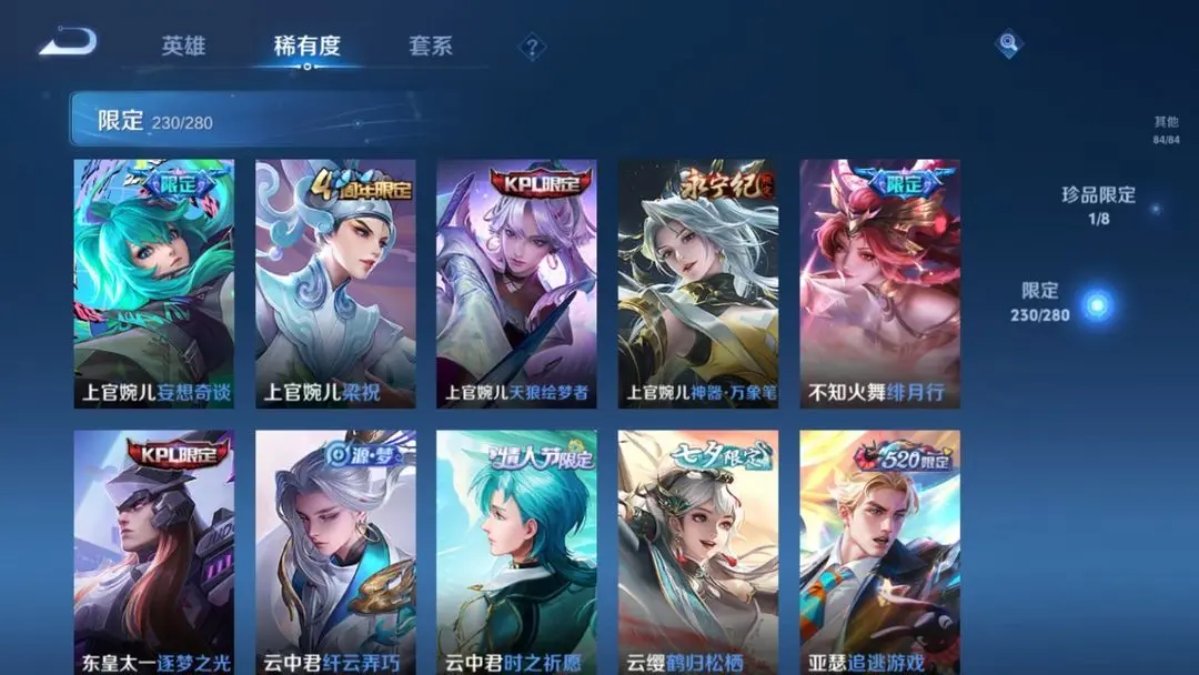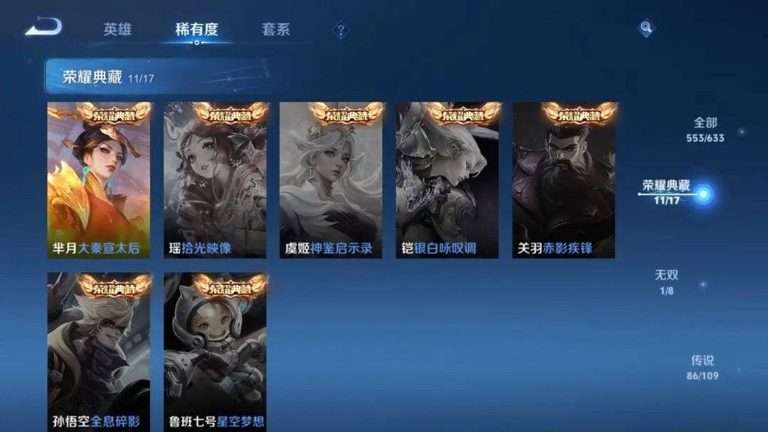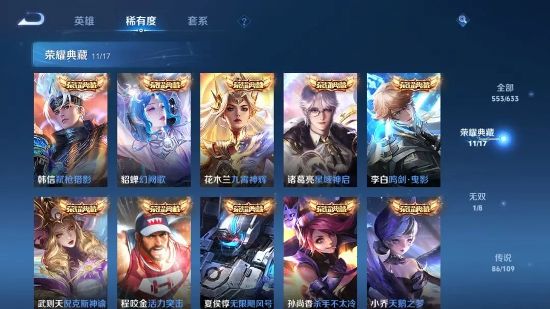 本游戏账号: V10用户,基础段位:至尊星耀I,英雄多,皮肤多。典藏皮肤11个,感受典藏皮肤带来的优质体验快感,FMVP皮肤10个,尽情享受FMVP皮肤带来的主角光环, 私人所属英雄皮肤有:诸葛亮 星域神启||孙尚香 杀手不太冷||芈月 大秦宣太后||夏侯惇 无限飓风号||李白 鸣剑·曳影||武则天 倪克斯神谕||貂蝉 幻阙歌||程咬金 活力突击||韩信 弑枪猎影||花木兰 九霄神辉||小乔 天鹅之梦,等等