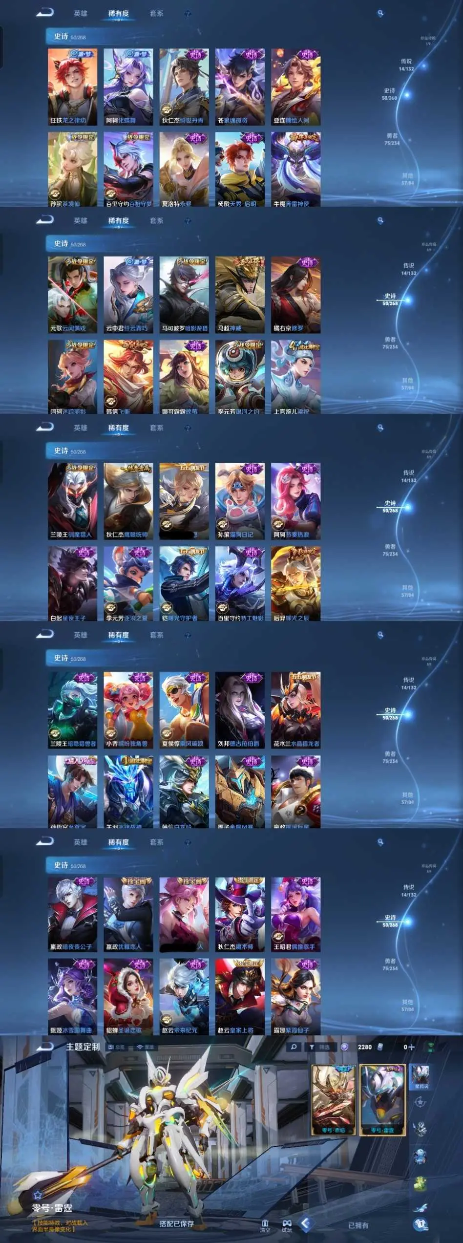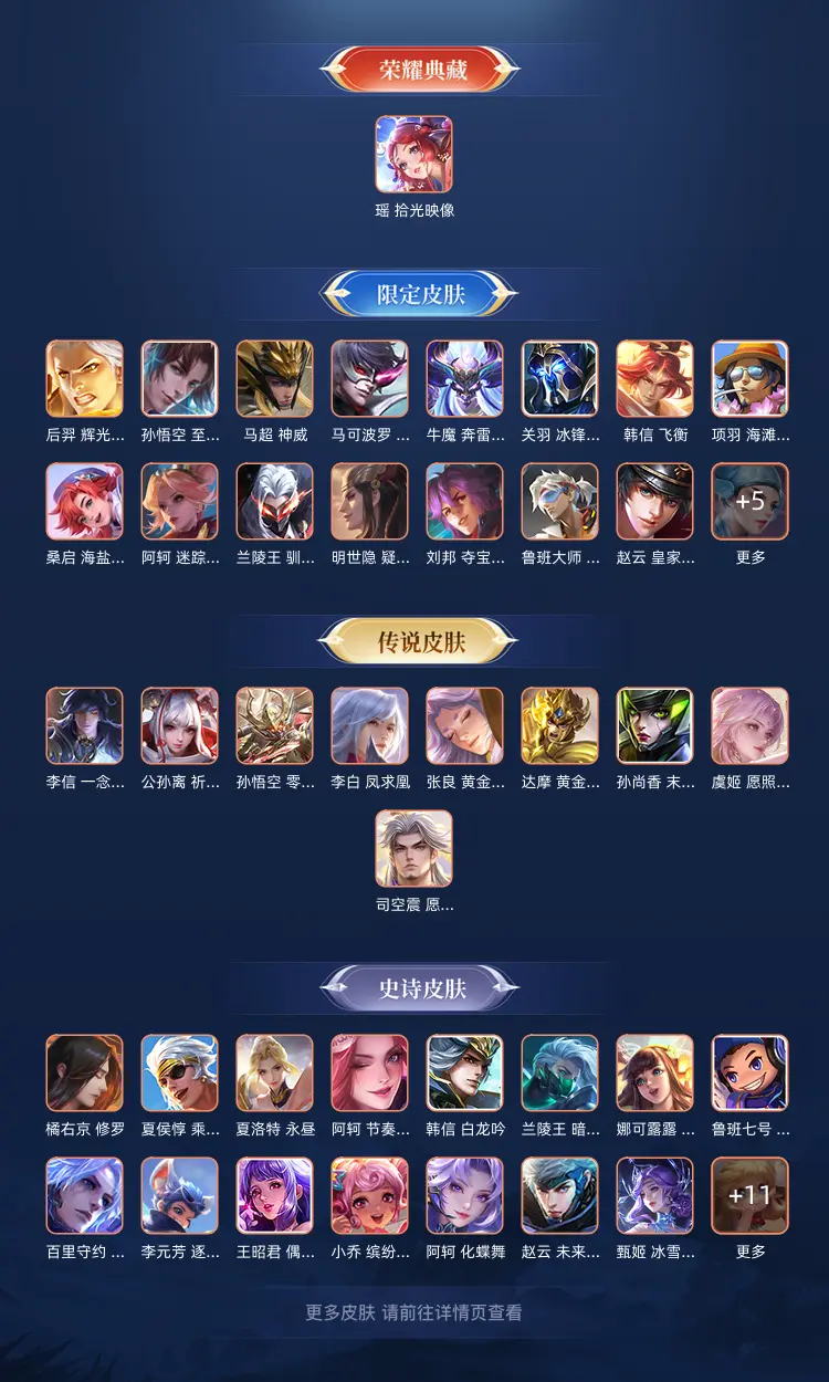 该号英雄128个皮肤180个,典藏1个,珍品传说3个,星传说1个,传说14个,史诗50个,祝你游戏愉快~
