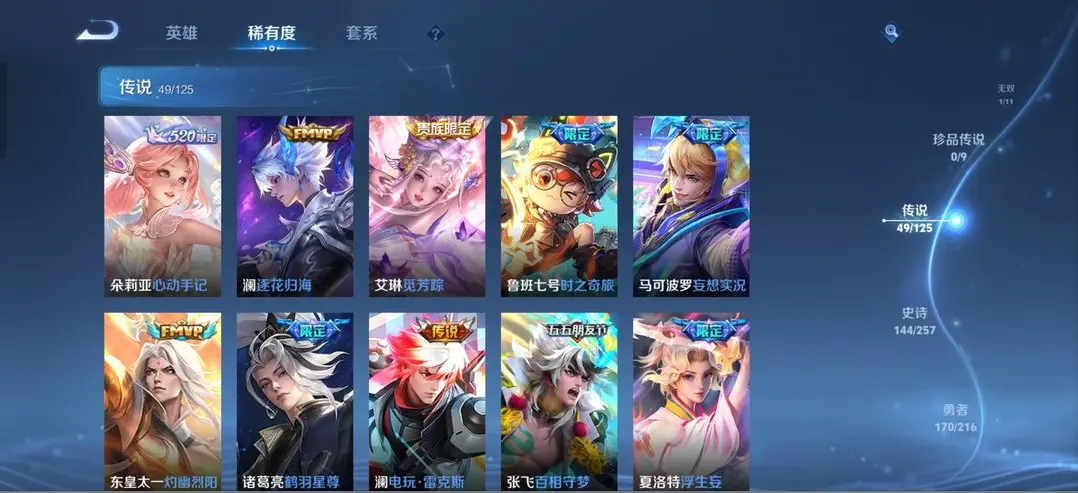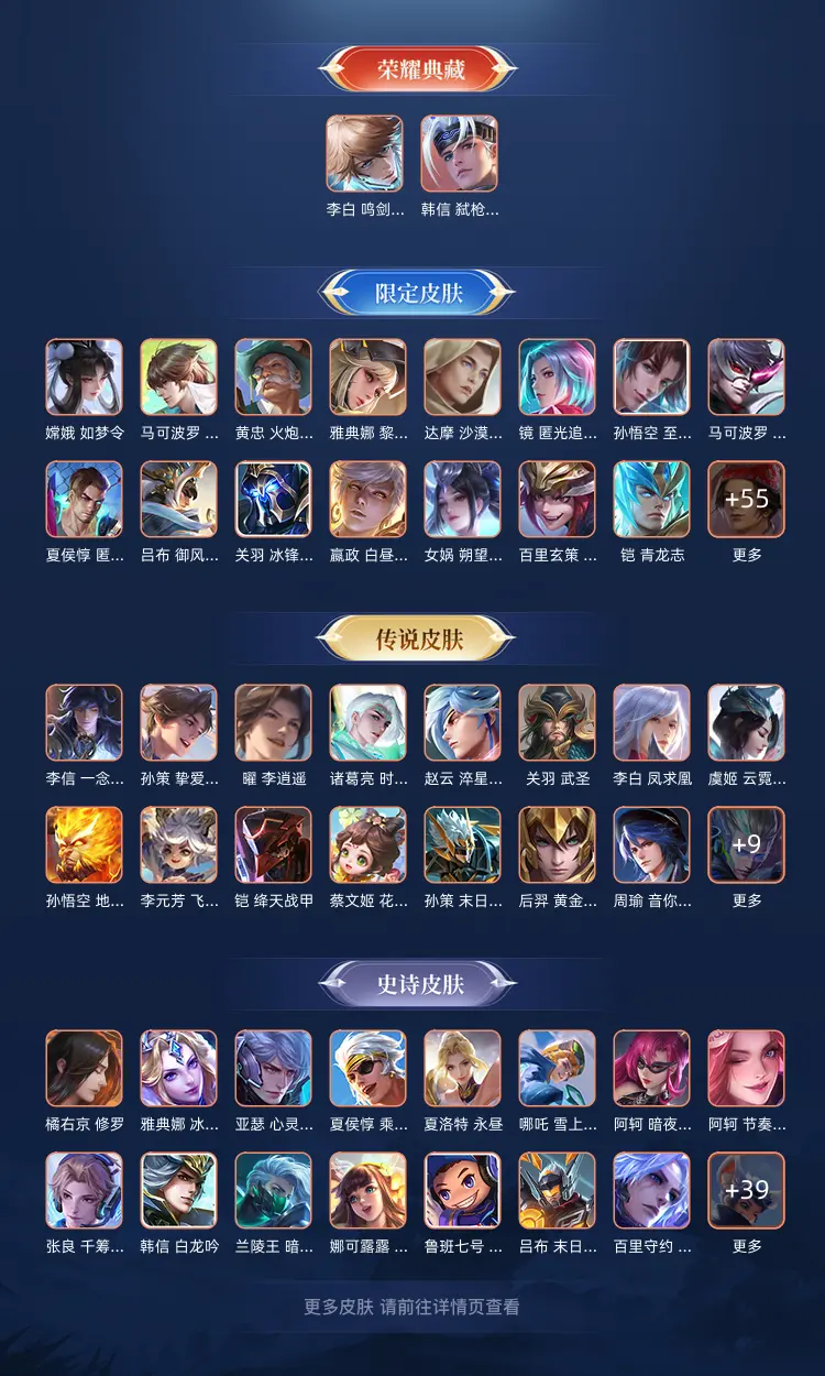 本游戏账号: V10用户,基础段位:最强王者,英雄多,皮肤多。典藏皮肤2个,感受典藏皮肤带来的优质体验快感,FMVP皮肤10个,尽情享受FMVP皮肤带来的主角光环, 私人所属英雄皮肤有:李白 鸣剑·曳影||韩信 弑枪猎影诸葛亮 鹤羽星尊||诸葛亮 武陵仙君||诸葛亮 时雨天司||铠 绛天战甲||百里守约 碎云||梦奇 胖达荣荣||孙尚香 末日机甲||鲁班七号 时之奇旅||孙策 挚爱之约||孙策 末日机甲||周瑜 音你心动||曜 李逍遥||澜 电玩·雷克斯||宫本武藏 地狱之眼||李白 诗剑行||李白 凤求凰||马可波罗 妄想实况||狄仁杰 超时空战士||达摩 黄金狮子座||夏洛特 浮生妄||关羽 武圣||貂蝉 仲夏夜之梦||王昭君 乞巧织情||花木兰 燃星之曲||艾琳 觅芳踪||张良 黄金白羊座||孙悟空 地狱火||后羿 黄金射手座||张飞 百相守梦||李元芳 飞鸢探春||虞姬 云霓雀翎||虞姬 启明星使||蔡文姬 花朝如约||裴擒虎 寅虎·赤拳||赵云 淬星耀世||李信 一念神