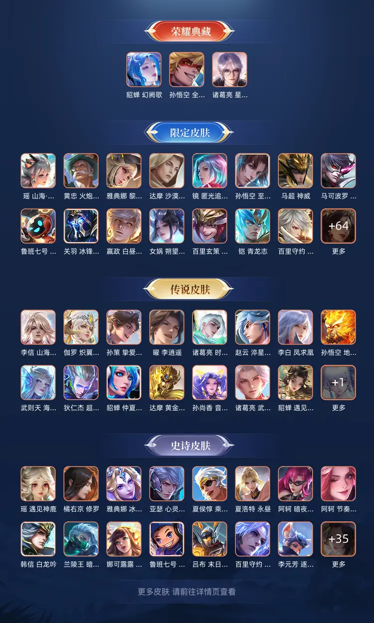 本游戏账号: V10用户,基础段位:至尊星耀III,英雄多,皮肤多。典藏皮肤2个,感受典藏皮肤带来的优质体验快感,FMVP皮肤2个,尽情享受FMVP皮肤带来的主角光环, 私人所属英雄皮肤有:孙悟空 全息碎影||貂蝉 幻阙歌诸葛亮 鹤羽星尊||诸葛亮 武陵仙君||诸葛亮 时雨天司||曜 李逍遥||孙悟空 齐天大圣||孙悟空 地狱火||孙尚香 音你闪耀||孙尚香 异界灵契||貂蝉 遇见胡旋||貂蝉 仲夏夜之梦||李白 凤求凰||李信 山海·炽霜斩||虞姬 启明星使||武则天 海洋之心||艾琳 觅芳踪||百里守约 碎云||狄仁杰 超时空战士||花木兰 燃星之曲||伽罗 炽翼辉光||赵云 淬星耀世||王昭君 乞巧织情||孙策 挚爱之约||达摩 黄金狮子座||张飞 百相守梦,等等