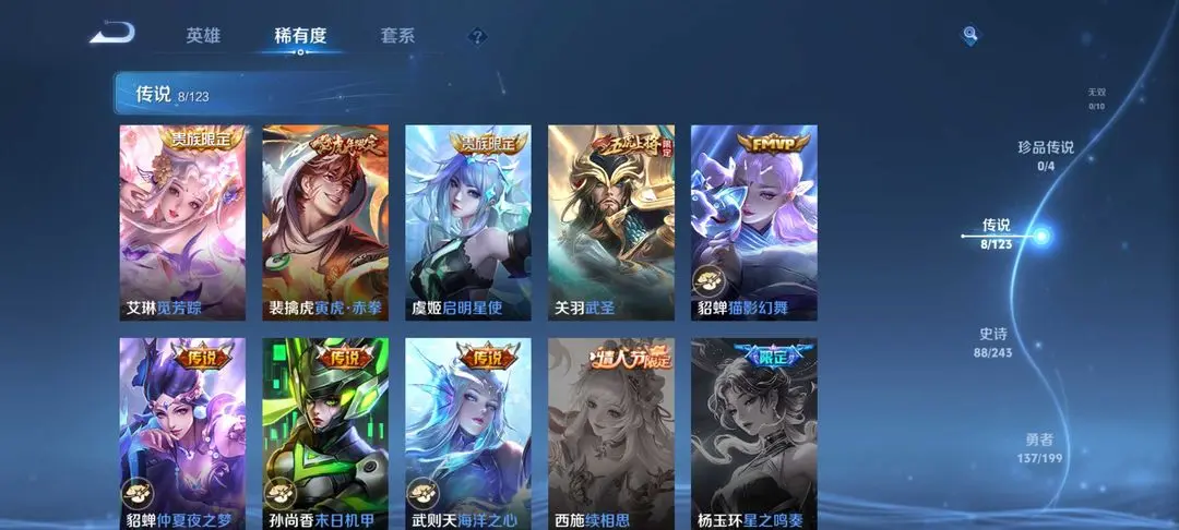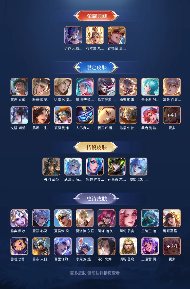 本游戏账号: V9用户,基础段位:最强王者,英雄多,皮肤多。典藏皮肤3个,感受典藏皮肤带来的优质体验快感,FMVP皮肤1个,尽情享受FMVP皮肤带来的主角光环, 私人所属英雄皮肤有:花木兰 九霄神辉||孙悟空 全息碎影||小乔 天鹅之梦孙尚香 末日机甲||武则天 海洋之心||关羽 武圣||貂蝉 仲夏夜之梦||艾琳 觅芳踪||虞姬 启明星使||裴擒虎 寅虎·赤拳,等等