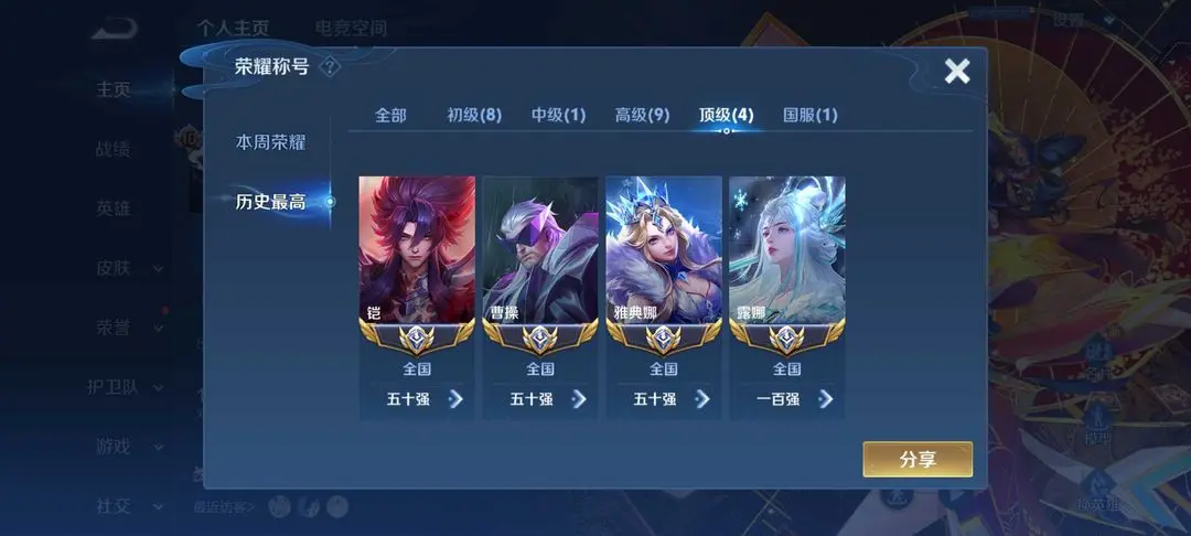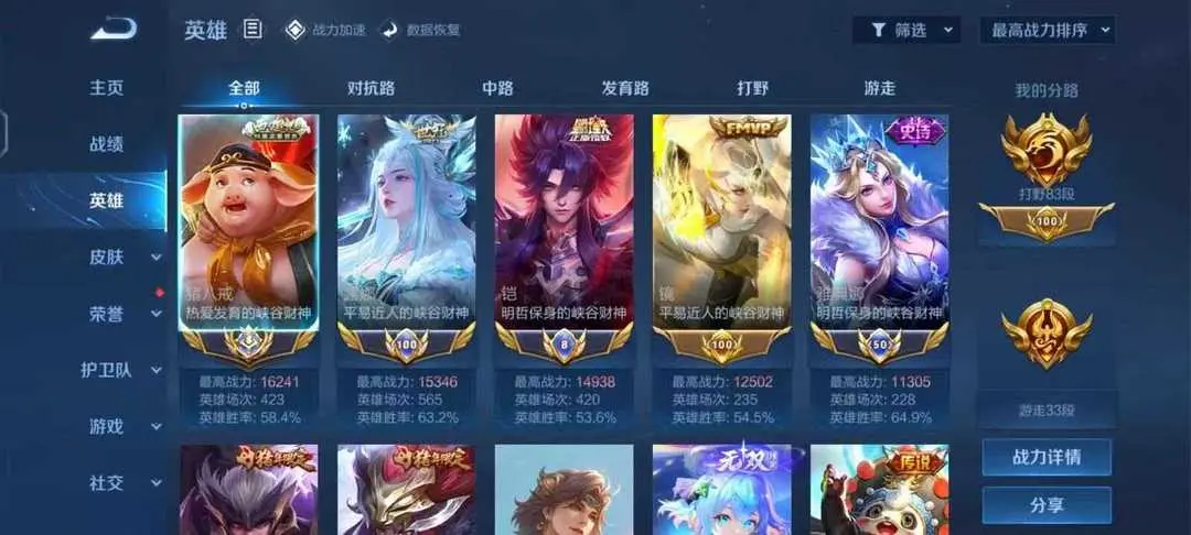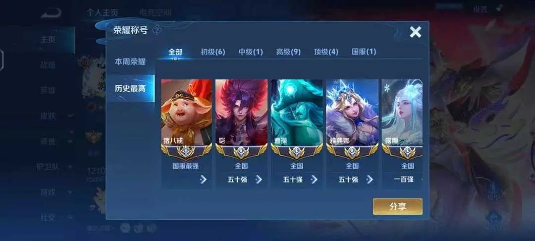 5国服✨83段打野✨大国猪八戒✨国5凯✨国服露娜曹操✨火舞无双✨小乔无双时之魔女