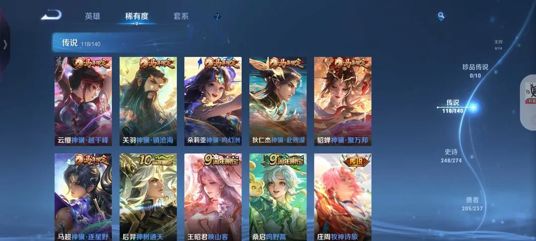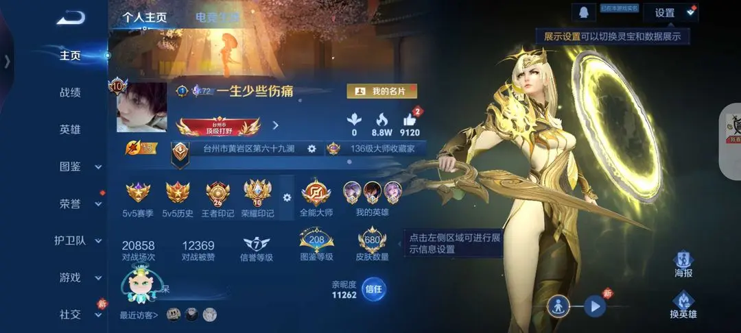 本游戏账号: V10用户,基础段位:至尊星耀IV,英雄多,皮肤多。典藏皮肤17个,感受典藏皮肤带来的优质体验快感,FMVP皮肤10个,尽情享受FMVP皮肤带来的主角光环, 私人所属英雄皮肤有:孙悟空 全息碎影||李白 鸣剑·曳影||孙尚香 杀手不太冷||韩信 弑枪猎影||花木