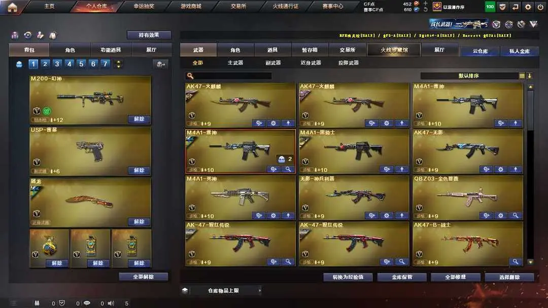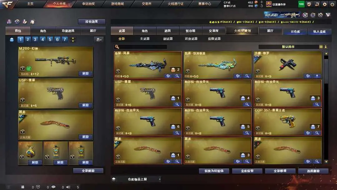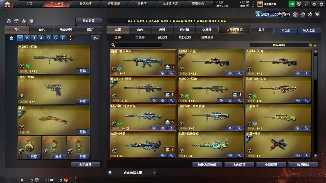本游戏账号:英雄武器53个; 王者武器16个。 可以玩爆破号、生化号、双全装、稀有武器、等模式。装备齐全拥有完美游戏体验。重要的是,特殊装备有:唐刀-神工天巧、AWM-天龙、AK47-火麒麟、闪光弹-竞技荣光、柯尔特-竞技荣光、高爆手雷-竞技荣光、USP-雷暴、烟雾弹-竞技荣光、擎天-竞技荣光、M200-竞技荣光、荣耀世冠-雷神、荣耀世冠-火麒麟、荣耀世冠-龙啸、麒麟刺、Barrett-朱雀、M4A1-雷神、Barrett-毁灭、幻灵之锋、M200-幻神、QBZ03-金色蔷薇、M4A1-黑骑士、火麒麟-灵狐、高爆手雷-雷霆王者、雷霆王者之锋-觉醒版、M4A1-雷霆王者-觉醒版、COP 357-雷霆王者-觉醒版、炫金火麒麟、炫金骑士、枪王之刃、手斧-SS、猫猫手套、金刚伞、源-金色蔷薇、加特林-炼狱-掌火、AK-47-A、AWM-A、M4A1-PINK、AWM-Pink、黄金M4A1-X、黄金KAC、斯泰尔-墨兰、G36C-宇航兔兔、G3A3-SS-枪王排位、悦蓝-惊涛骇浪-觉醒版