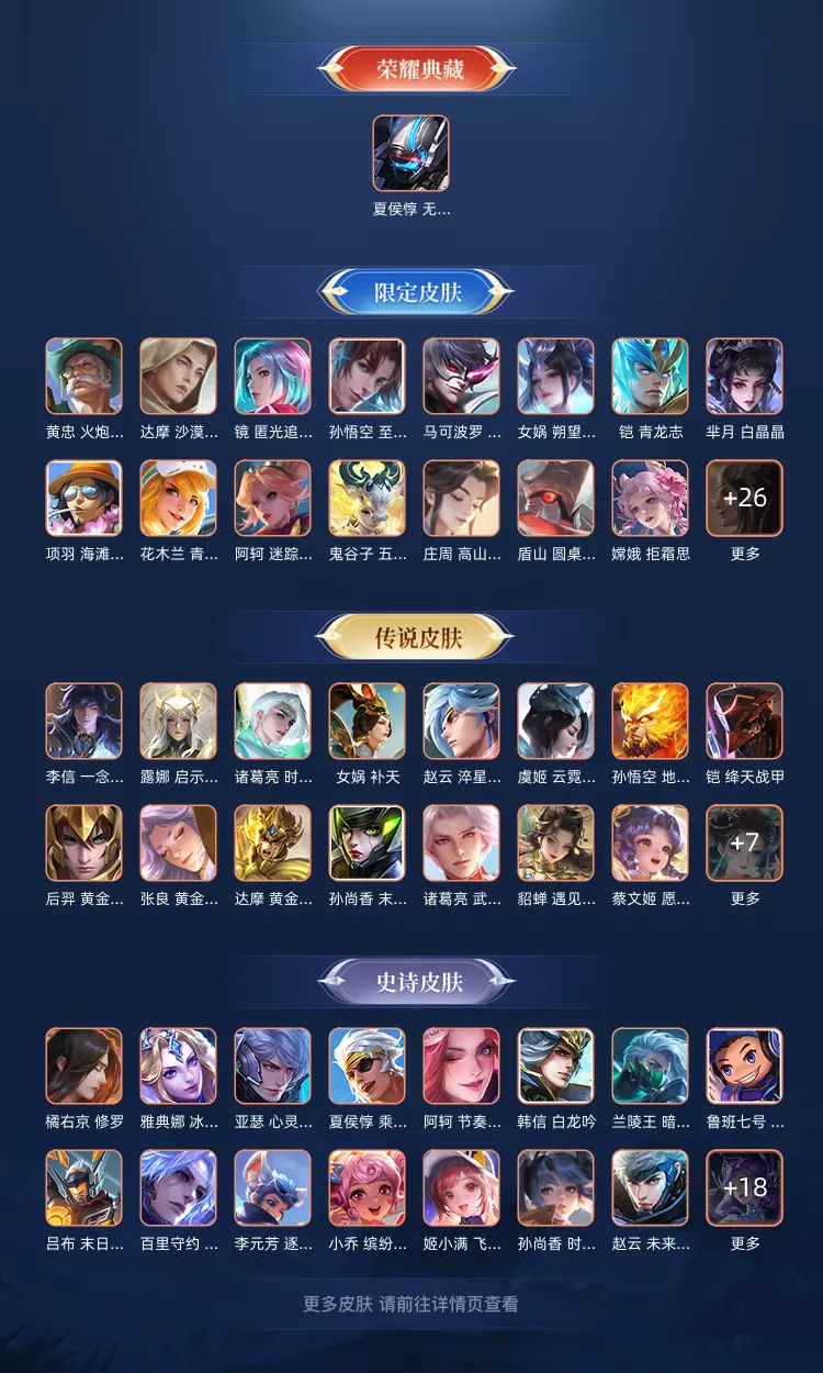 本游戏账号: ,英雄多,皮肤多。典藏皮肤1个,感受典藏皮肤带来的优质体验快感,FMVP皮肤4个,尽情享受FMVP皮肤带来的主角光环, 私人所属英雄皮肤有:夏侯惇 无限飓风号妲己 愿照·众生和||诸葛亮 时雨天司||诸葛亮 武陵仙君||孙悟空 地狱火||桑启 鸣野蒿||嬴政 玄雷天君||王昭君 乞巧织情||后羿 黄金射手座||夏洛特 浮生妄||虞姬 云霓雀翎||虞姬 启明星使||虞姬 愿照·岁时盈||貂蝉 遇见胡旋||澜 电玩·雷克斯||澜 愿照·九州拓||张良 黄金白羊座||孙策 时之奇旅||司空震 愿照·山河定||赵云 淬星耀世||蔡文姬 愿照·福禄聚||女娲 补天||女娲 愿照·千秋盛||露娜 启示之音||铠 绛天战甲||云缨 鹤归松栖||云缨 幻光神枪||兰陵王 影龙天霄||宫本武藏 地狱之眼||梦奇 胖达荣荣||达摩 黄金狮子座||孙尚香 末日机甲||李信 一念神魔,等等