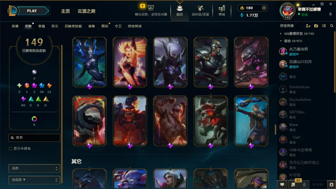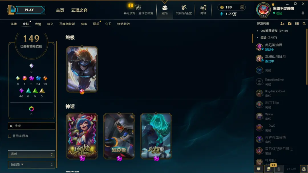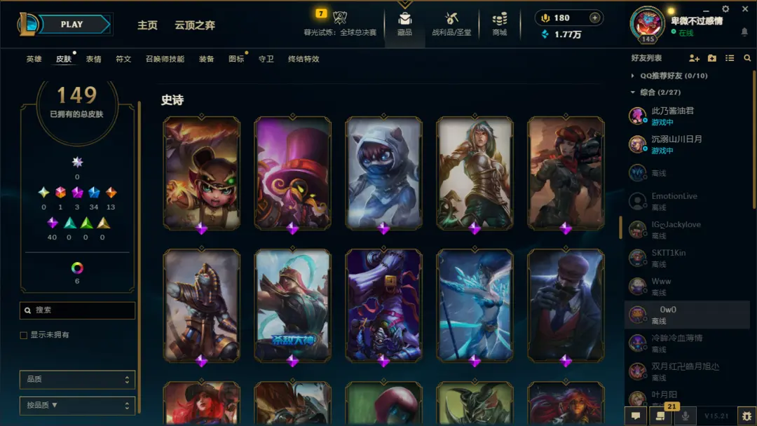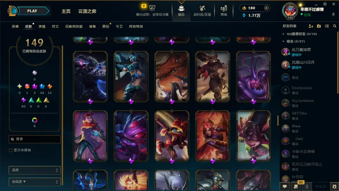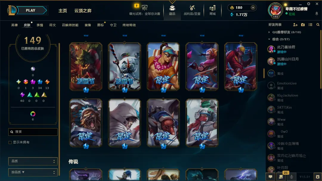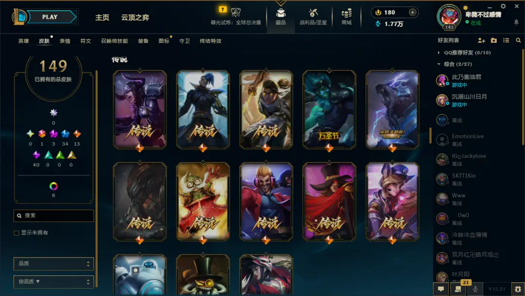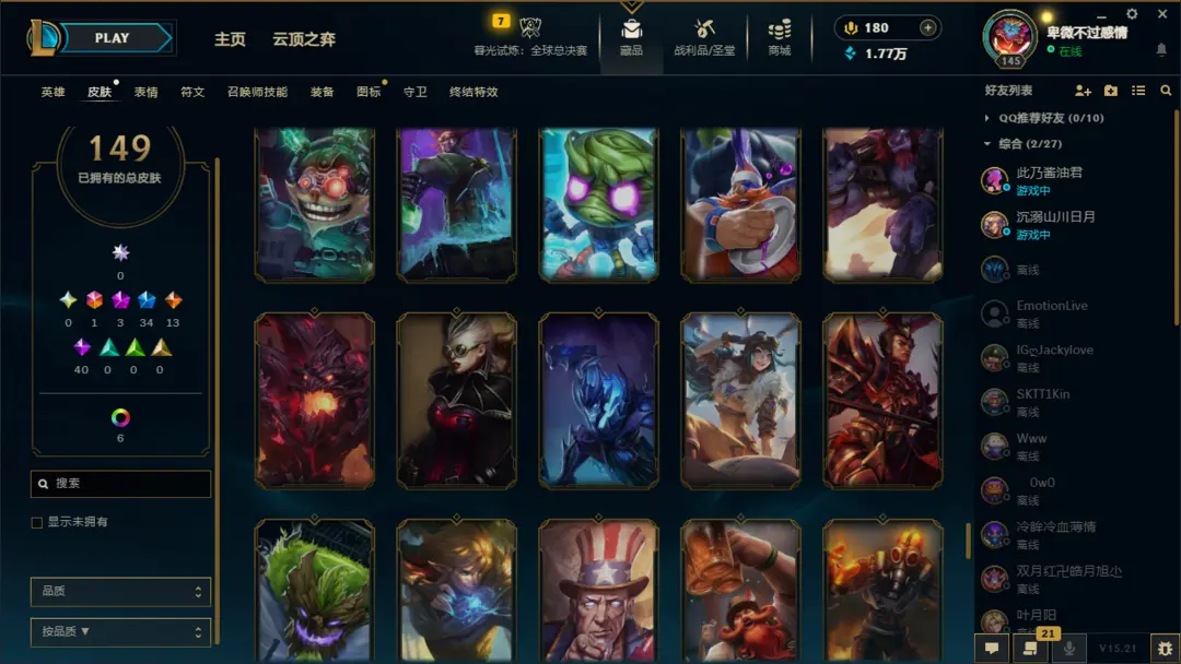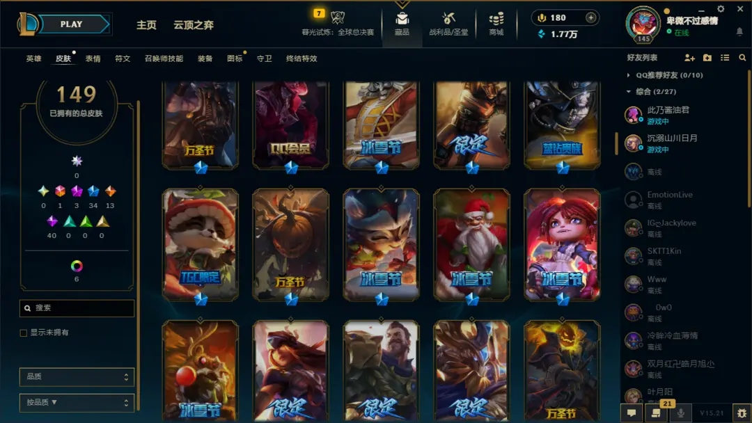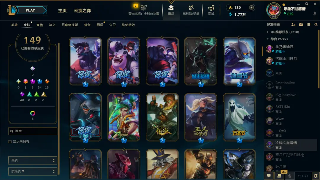 英雄:恶魔小丑;盲僧;狂野女猎手;德玛西亚皇子;疾风剑豪;德邦总管;暗夜猎手;荣耀行刑官;影流之主;探险家;刀锋之影;无双剑姬;黑暗之女;魂锁典狱长;法外狂徒;放逐之刃;蒸汽机器人;圣枪游侠;蛮族之王;光辉女郎;卡牌大师;诺克萨斯之手;不屈之枪;海洋之灾;齐天大圣;不祥之刃;潮汐海灵;诡术妖姬;无极剑圣;傲之追猎者;暗裔剑魔;熔岩巨兽;复仇焰魂;离群之刺;未来守护者;堕落天使;虚空掠夺者;戏命师;时间刺客;邪恶小法师;殇之木乃伊;正义天使;九尾妖狐;复仇之矛;麦林炮手;奥术先驱;武器大师;风暴之怒;荒漠屠夫;深海泰坦;符文法师;德玛西亚之力;战争之影;弗雷尔卓德之心;迅捷斥候;寒冰射手;酒桶;祖安狂人;狂暴之心;牛头酋长;刀锋舞者;虚空之女;赏金猎人;虚空恐惧;虚空行者;永猎双子;曙光女神;仙灵女巫;暴走萝莉;狂战士;瘟疫之源;巨魔之王;皮城女警;圣锤之毅;青钢影;雪原双子;机械公敌;沙漠死神;牧魂人;北地之怒;沙漠皇帝;血港鬼影;战争女神;炼金术士;冰晶凤凰;扭曲树精;唤潮鲛姬;星界游神;远古恐惧;披甲龙龟;天启者;蜘蛛女皇;发条魔灵;惩戒之箭;爆破鬼才;皎月女神;德玛西亚之翼;影流