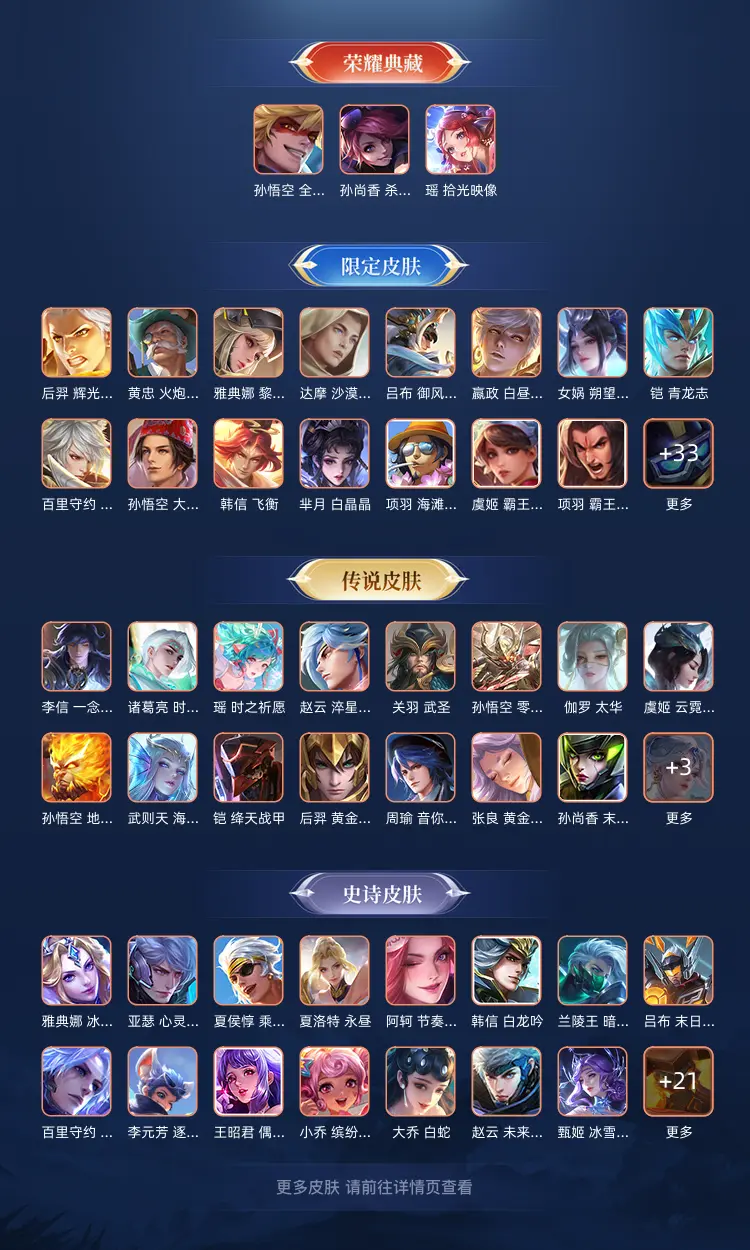 本游戏账号: V9用户,基础段位:永恒钻石V,英雄多,皮肤多。典藏皮肤11个,感受典藏皮肤带来的优质体验快感,FMVP皮肤9个,尽情享受FMVP皮肤带来的主角光环, 私人所属英雄皮肤有:诸葛亮 星域神启||铠 银白咏叹调||孙尚香 杀手不太冷||鲁班七号 星空梦想||李白 鸣剑·曳影||武则天 倪克斯神谕||关羽 赤影疾锋||貂蝉 幻阙歌||花木兰 九霄神辉||孙悟空 全息碎影||小乔 天鹅之梦,等等