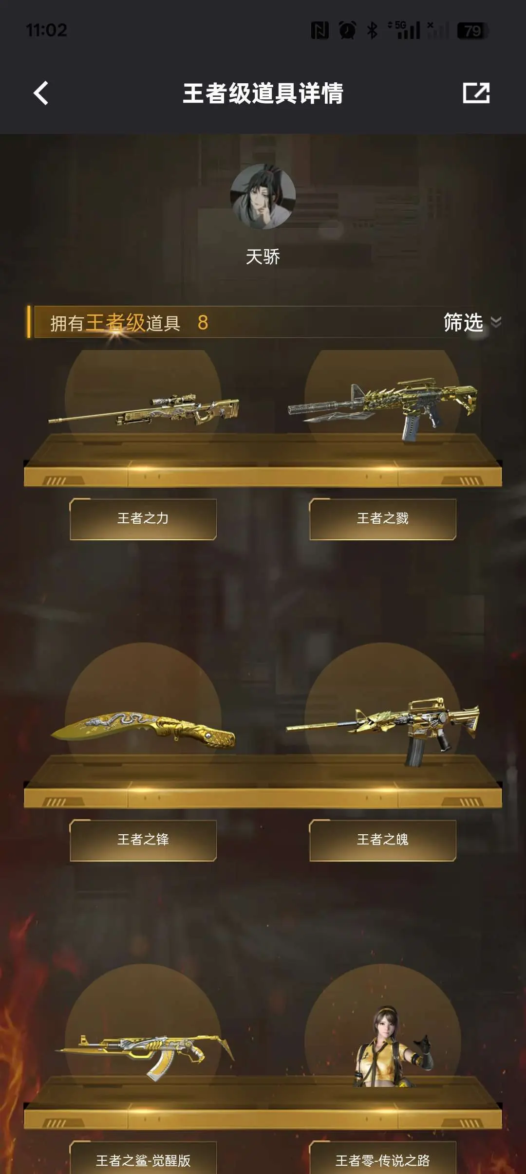 王者零,王者零-传说之路,狐影,灵狐黄金海岸,樱。火麒麟,雷神,黑龙,黑骑士,无影,黑武士,黑鲨,龙血,玫瑰,QBZ蔷薇,AK猩红传说,AK战士,AK战神,天龙,毁灭,极光,Barrett-蔷薇,Barrett-暗月传说,盘龙,炼狱,AA-12-雷霆,修罗,天神,屠龙,龙啸,麒麟刺,雷霆套,M4雷神-刀锋,王者之魄,王者之力,王者之鲨,王者之锋,皮肤:极光-能量核心,黑龙-能量核心,修罗CFSTAR,火麒麟CFSTAR,黑骑士耀金,火麒麟-雷神,火麒麟AG,雷神暗月,屠龙荣耀,边框名片该有的都有,满盘龙炼狱,生化全装爆破全装道具都有。