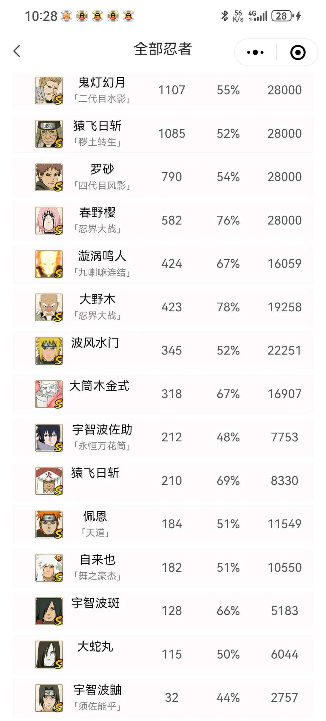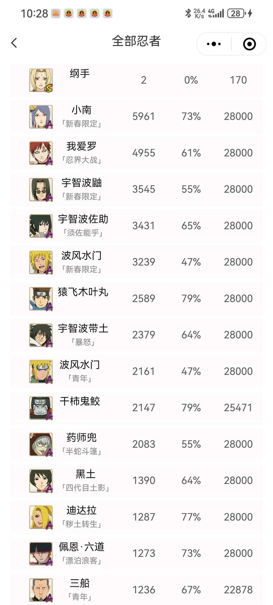 战斗力:1502W+;段位:见习1阶;本服排名:126;战区排名:未上榜;VIP12级;S忍30个;A忍48个;通灵兽19个;S忍:猿飞日斩(5星),九喇嘛连结漩涡鸣人,永恒万花筒宇智波佐助,忍界大战春野樱,舞之豪杰自来也,大蛇丸,纲手,百豪纲手,死门迈特凯,波风水门,秽土转生波风水门,秽土转生猿飞日斩,秽土转生千手扉间,秽土转生千手柱间,宇智波斑,秽土转生宇智波斑,木叶创立宇智波斑,须佐能乎宇智波鼬,秽土转生宇智波鼬,白面具宇智波斑,忍界大战宇智波带土,四代目风影罗砂,二代目水影鬼灯幻月,忍界大战大野木,秽土转生半藏,二代目土影无,天道佩恩,超佩恩天道,仙人模式药师兜,大筒木金式;A忍:迈特凯(5星),猿飞阿斯玛(5星),蝎(5星),干柿鬼鲛(5星),疾风传我爱罗(4星),飞段(4星),仙人模式漩涡鸣人,九尾查克拉漩涡鸣人,须佐能乎宇智波佐助,宇智波泉奈,忍界大战秋道丁次,忍界大战日向宁次,忍界大战李洛克,幻之真容旗木卡卡西,宇智波止水,火影继承人猿飞日斩,新春限定波风水门,青年波风水门,忍界大战我爱罗,近松十人卫千代,五代目水影照美冥,奇拉比,忍界大战奇拉比,青年艾,青年三船