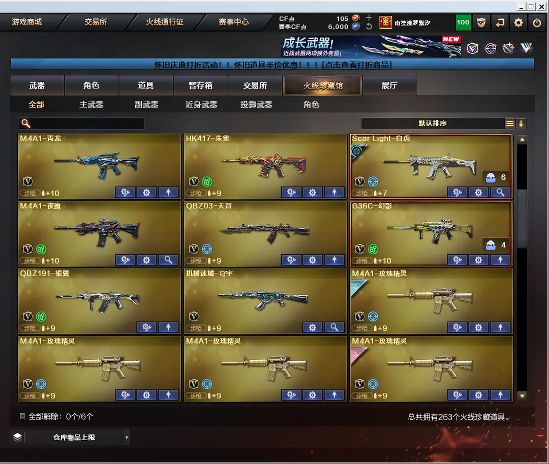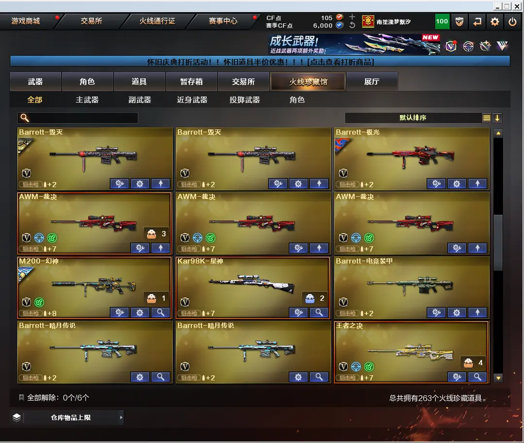 【英雄武器】:【M4A1-死神-1,AK12-天启-2,M4A1-武圣-1,AN94-超新星-1,M4A1-千变-1,M4A1-黑骑士-7,M4A1-玫瑰精灵-5,AK47-黑武士-2,屠龙-2,AK47-机械迷城-1,龙啸-2,AK47-无影-4,麒麟刺-1,AK47-火麒麟-4,AWM-天龙-5,Barrett-毁灭-4,汤姆逊-烈龙-6,Barrett-极光-1,RPK-