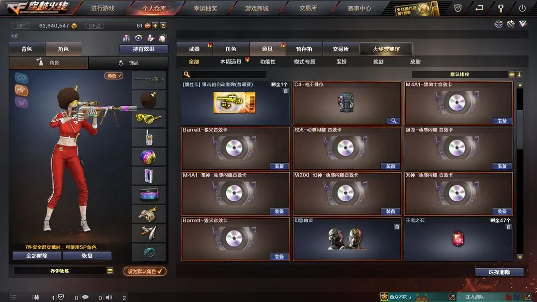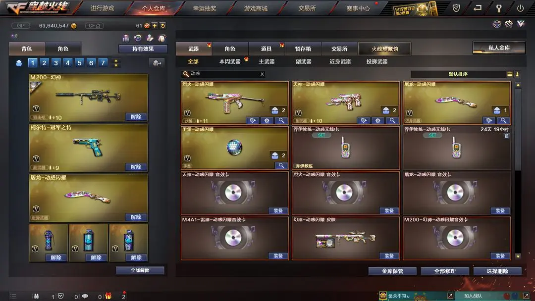 【装备道具】:动感闪耀幻神皮肤★动感闪耀幻神音效卡★丹凤幻神皮肤★M200-幻神★动感闪耀全套★烈火动感闪耀音效★天神动感闪耀音效★屠龙动感闪耀音效★雷神动感闪耀音效卡★乔伊教练★黑骑士音效卡★毁灭音效卡★极光音效卡★毁灭枪娘格雷姐妹★火麒麟传奇EVEN★耀金毁灭★耀金黑骑士★毁灭CFS2018★火麒麟战神关羽★星空雷神★星空毁灭★王者零国色天香★王者瞳闭月羞花★冠军之特★8音效卡★HK417-朱雀★qbz-金色蔷薇★觉醒王者之光★觉醒王者风吟★王者之魄★擎天竞技荣光★炫金火麒麟★炫金天龙★水晶宝珠★狐影★乔伊教练★零热舞青春★灵狐花神★枪娘6烈龙★迷你手枪★蝴蝶刀排位★黄金生化钩★生化弹夹防化服变异宝贝死亡之眼对讲机不退包★佣兵觉醒无需换弹手斧镜减速雷★捕食者之眼查看血量★