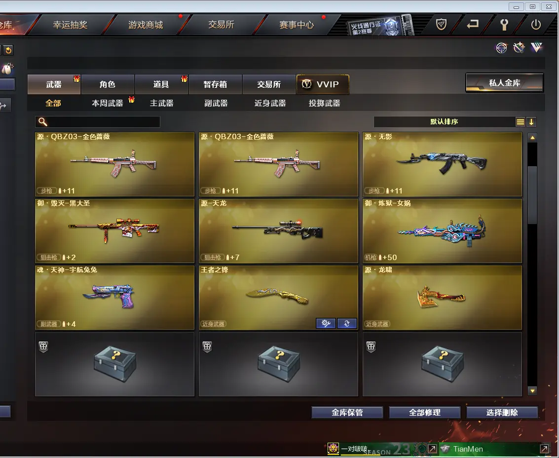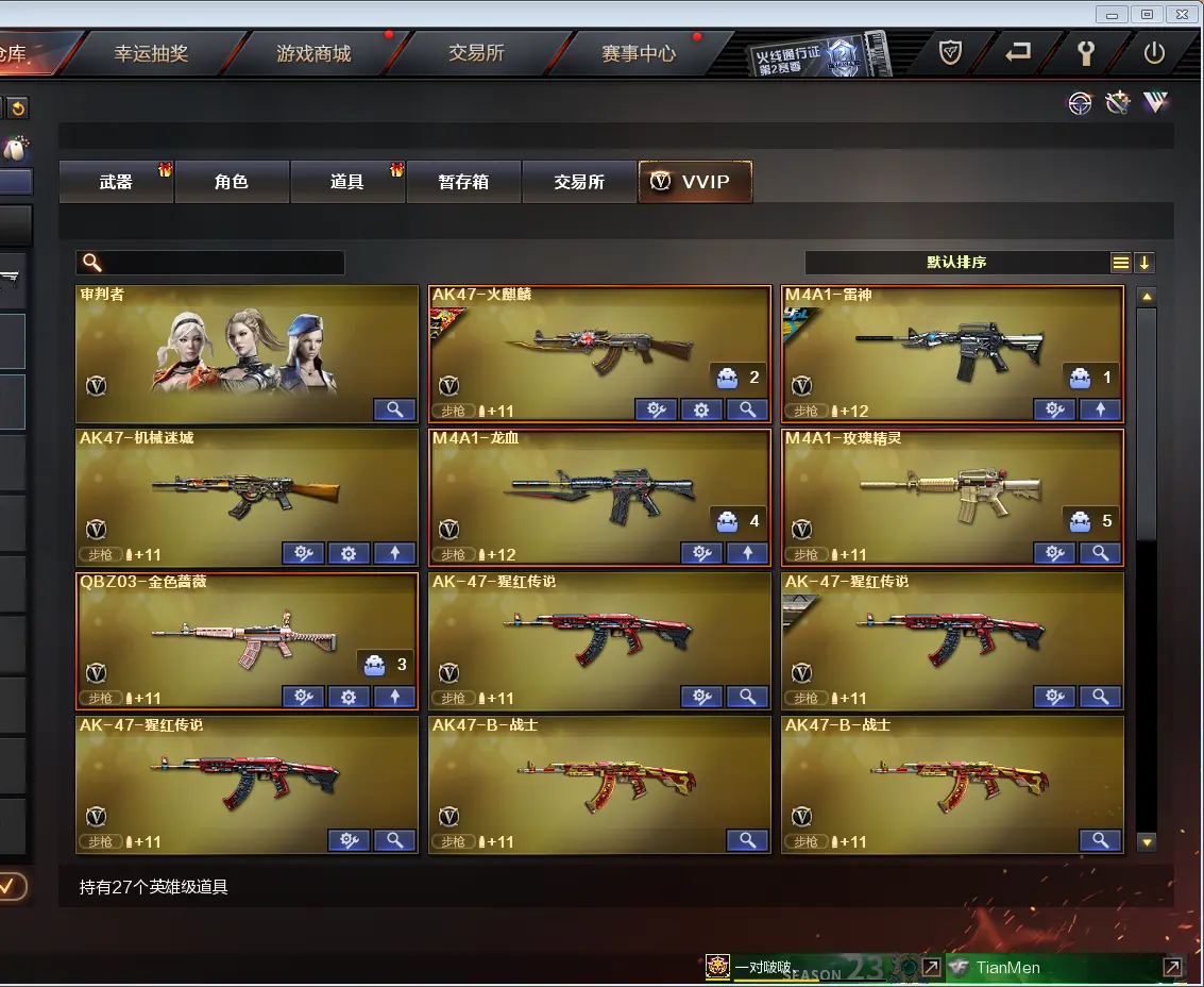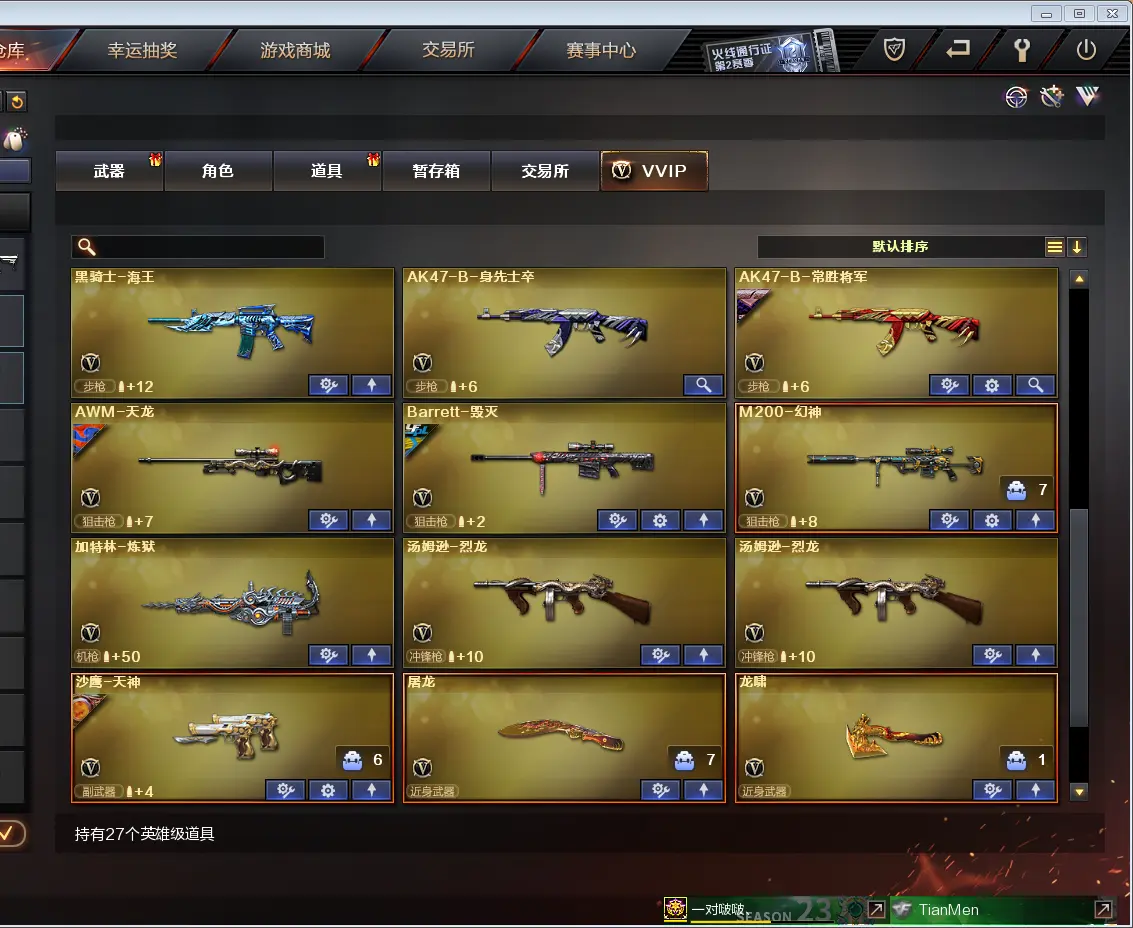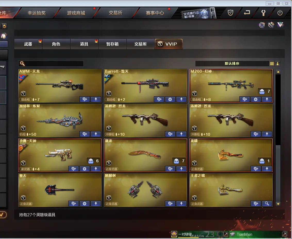 【英雄武器】:【M4A1-黑骑士-3,M4A1-玫瑰精灵-1,AK47-黑武士-1,屠龙-3,AK47-机械迷城-1,龙啸-1,AK47-无影-1,麒麟刺-1,AK47-火麒麟-1,女皇利刃-幻兽-1,AK47-麒麟-1,闪光弹-幻兽-1,AWM-天龙-1,烟雾弹-幻兽-1,Barrett-毁灭-1,汤姆逊-烈龙-2,沙鹰-修罗-1,沙鹰-天神-2,高爆手雷-幻兽-1,M4A1-雷神-1,沙鹰-幻兽-1,M4A1-黑龙-2,9A91-烈火-1,M200-幻神-1,高爆手雷-雷暴-1,烟雾弹-雷霆-4,闪光弹-雷霆-4,闪光弹-雷暴-1,烟雾弹-雷暴-1,斩神刀-雷暴-1,高爆手雷-雷霆-4,AK-47-猩红传说-5,无影-神兵利器,AA-12-雷霆,Barrett-暗月传说,QBZ03-金色蔷薇,barrett-金色蔷薇,烈火-动感闪耀,手雷-动感闪耀,天神-动感闪耀,屠龙-动感闪耀