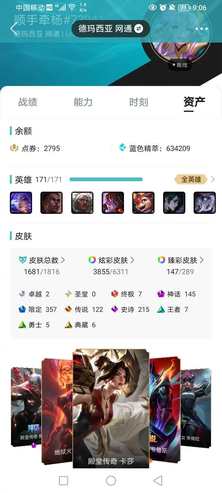 德玛西亚可排位,原皮1780, 加炫彩6000,限定基本全,神话145,臻彩200