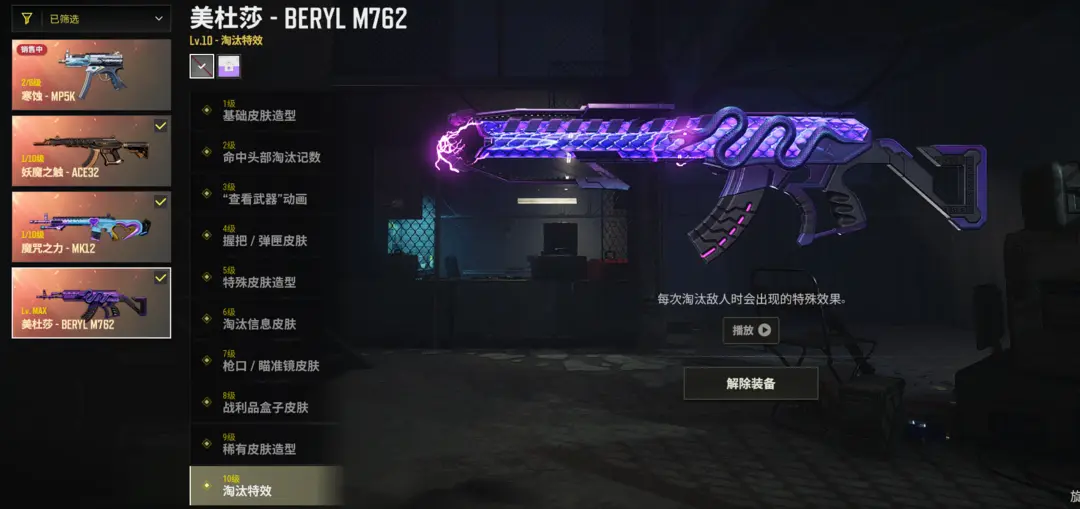 ⑩级美杜莎M762✅(异色)妖魔之触ACE✅寒蚀MP5K✅魔咒Mk12✅黑鬼金面多载具