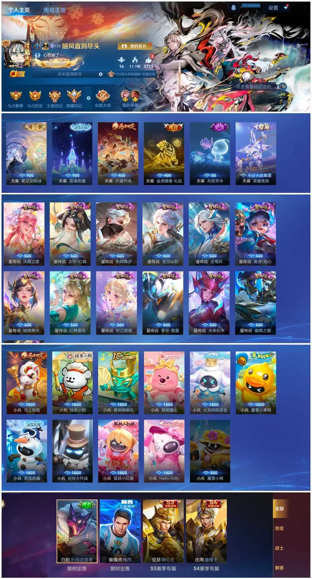 本游戏账号: V10无双贵族用户,基础段位:至圣王者,英雄多,皮肤多。典藏皮肤16个,感受典藏皮肤带来的优质体验快感,FMVP皮肤11个,尽情享受FMVP皮肤带来的主角光环, 私人所属英雄皮肤有:武则天 倪克斯神谕||瑶 拾光映像||孙尚香 杀手不太冷||虞姬 神鉴启示录||貂蝉 幻阙歌||李白 鸣剑·曳影||韩信 弑枪猎影||孙悟空 全息碎影||鲁班七号 星空梦想||伽罗 最初的交响||夏侯惇 无限飓风号||诸葛亮 星域神启||铠 银白咏叹调,等等