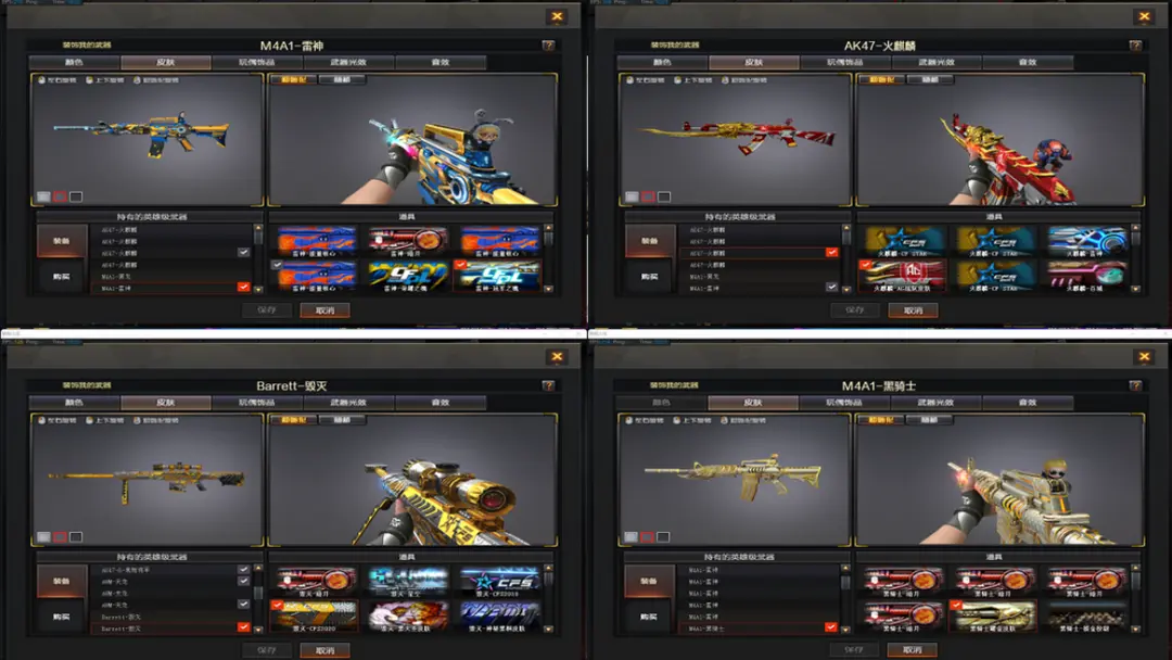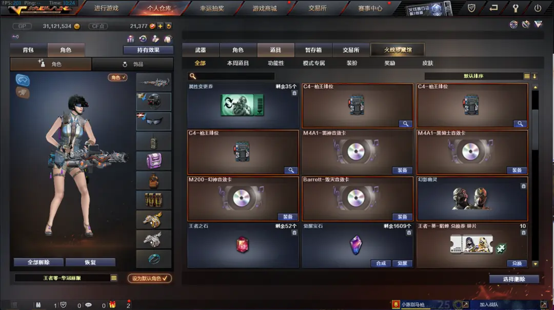 优质装备:【M4A1-死神-1,AN94-超新星-1,M4A1-黑骑士-1,M4A1-玫瑰精灵-1,屠龙-2,AK47-火麒麟-1,Barrett-毁灭-1,沙鹰-天神-2,M4A1-雷神-1,M4A1-黑龙-1,9A91-烈火-1,M200-幻神-1,USP-雷暴-1,M200-竞技荣光-1,幻灵之锋-1,擎天-竞技荣光-1,柯尔特-竞技荣光-2,烟雾弹-竞技荣光-4,闪光弹-竞技荣光-4,高爆手雷-竞技荣光-4,Scar Light-白虎-1,黑武士-锦绣游龙-1,COP-堕天神-1,高爆手雷-堕天神-3,龙啸-堕天神-2,麒麟刺-堕天神-1,闪光弹-堕天神-3,烟雾弹-堕