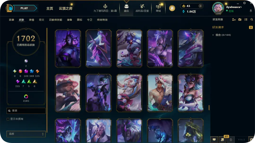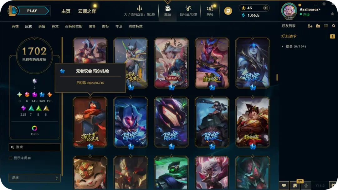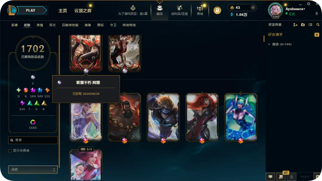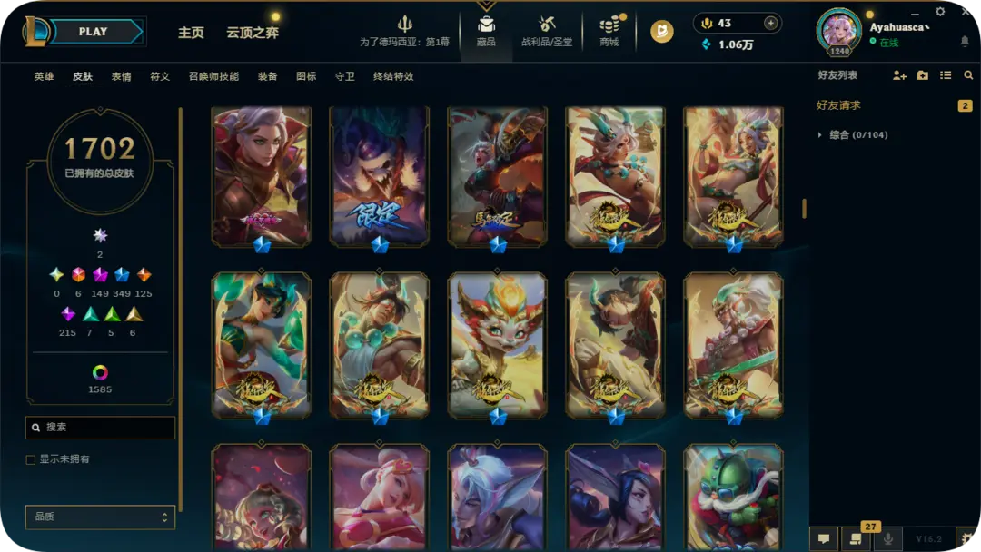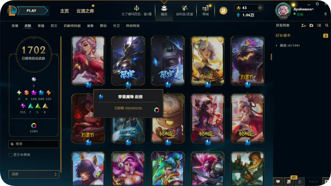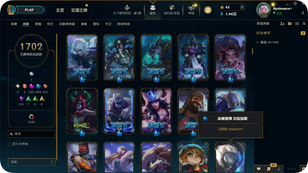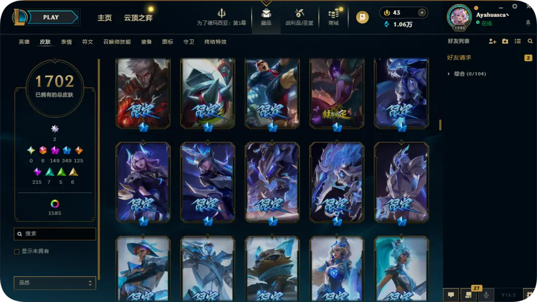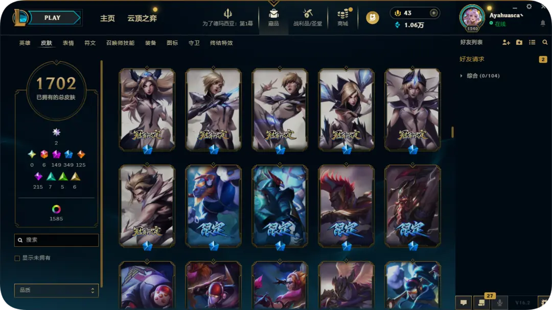 8000皮肤1812原皮肤蓝龙瞎双名人堂不朽阿狸卡莎9终极冰原酒桶战熊骑士穿星斩星全套S冠军战队系列
