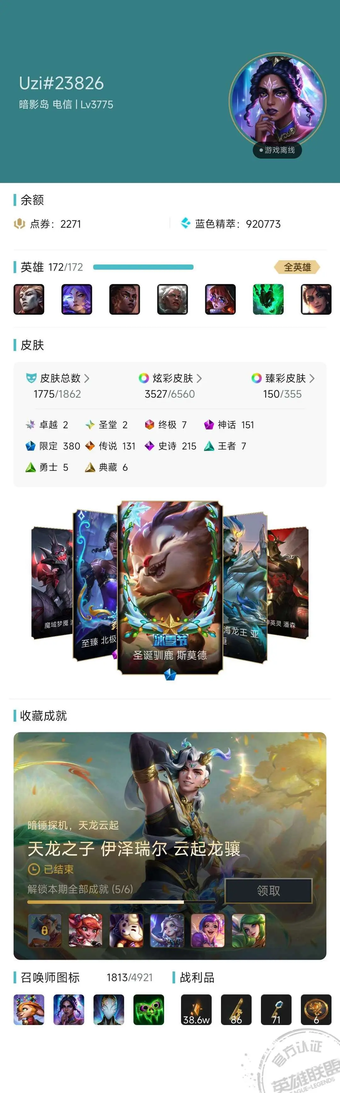 租前请看:原皮1773,炫彩3520,全至臻神话系列皮肤。云顶至臻龙的传人小小李青,神话级灵魂莲华阿狸、斗魂格温、神龙烈焰金克斯、神龙亚索、青花瓷拉克丝、神龙尊者李青、福星安妮小小英雄,神话级KDA、虎啸龙呤、群星依旧在、胖胖龙度假村棋盘等海量小小英雄与棋盘!