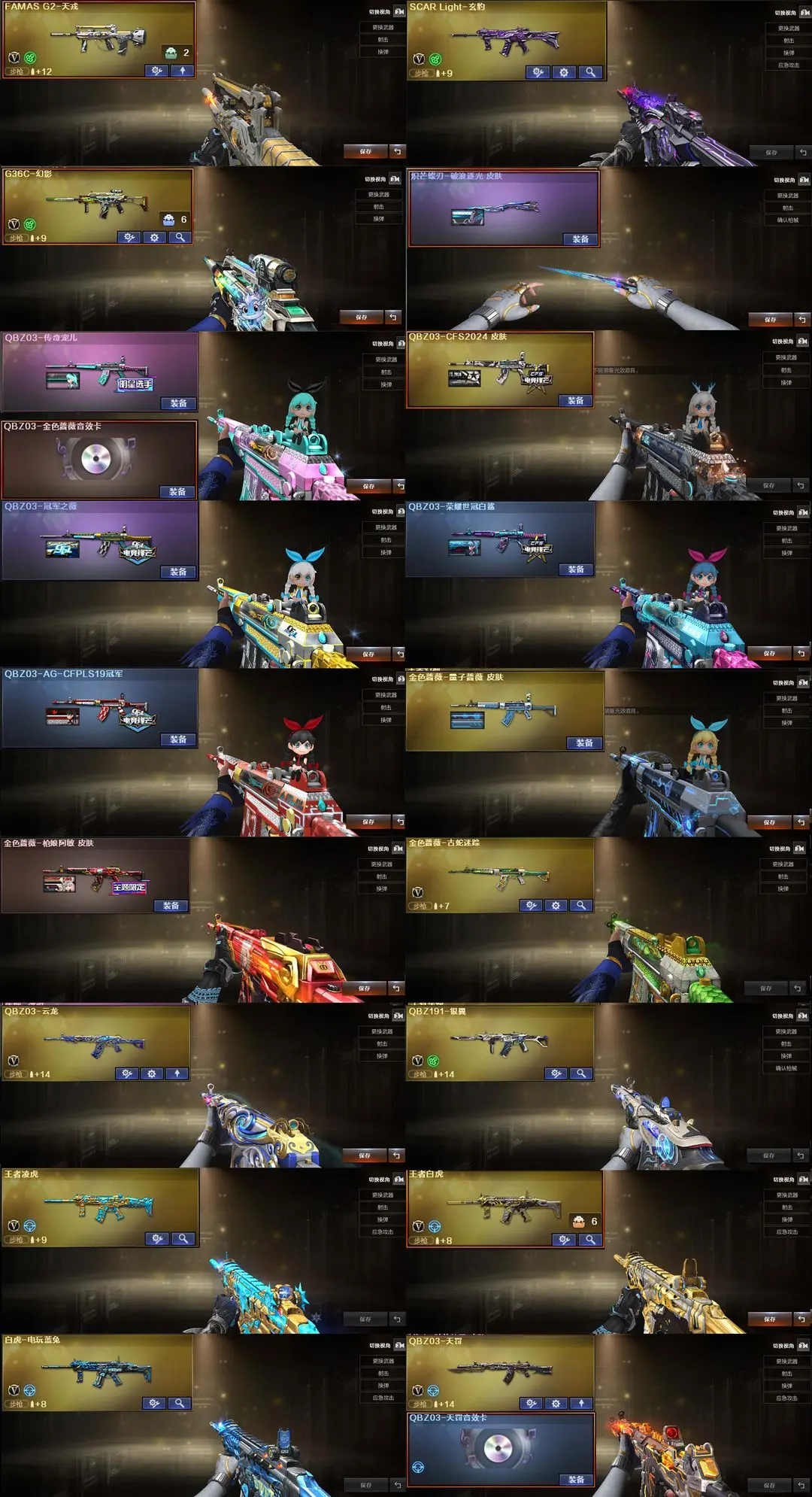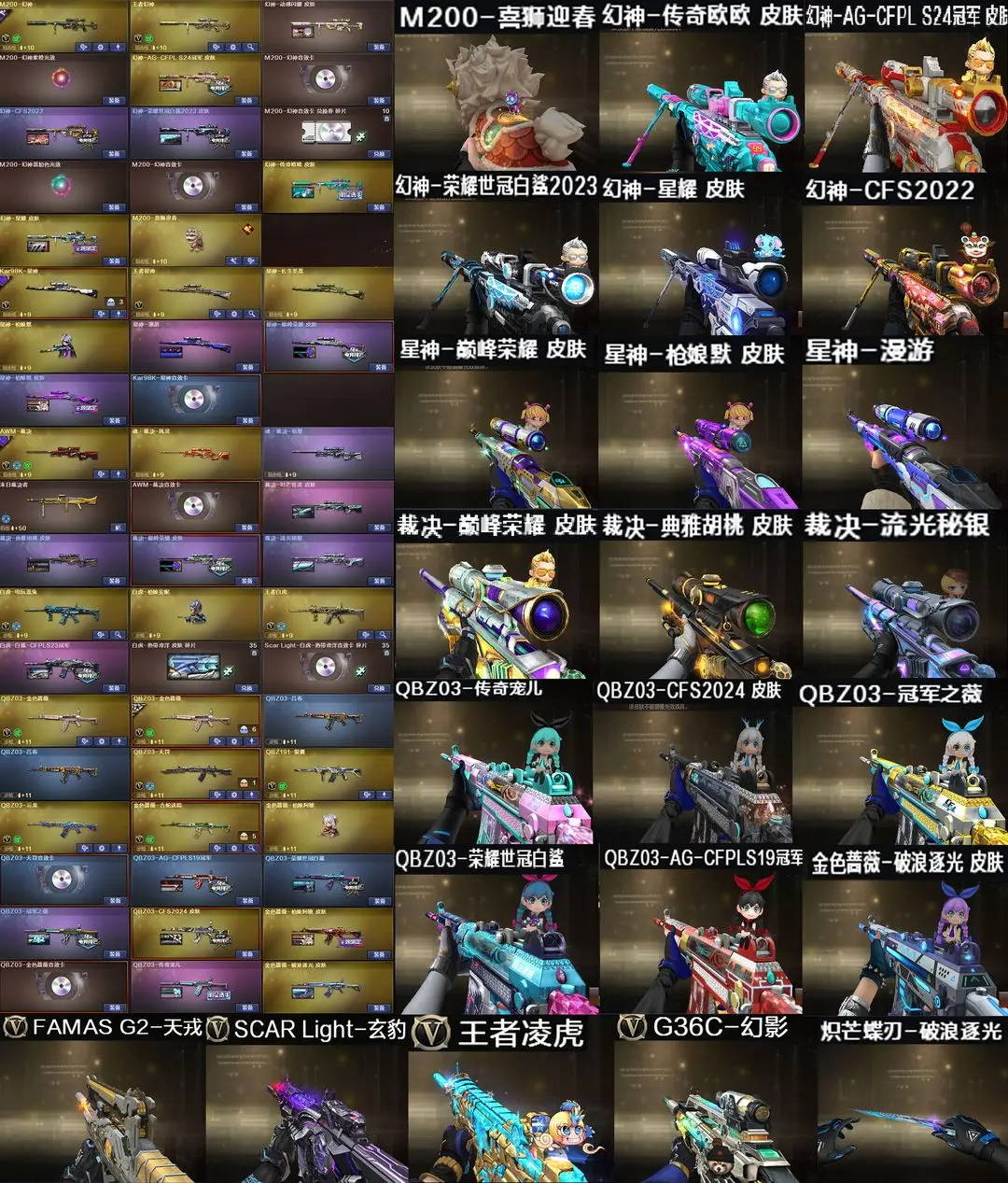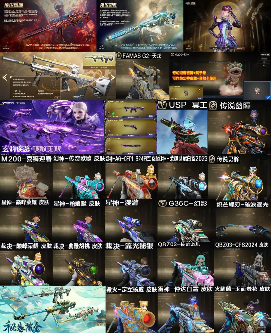 【装备道具】: 传说幽瞳/传说灵眸/传说星骇❤幻神-动感闪耀/幻神-AG-CFPL S24冠军/幻神-欧欧/幻神-荣耀世冠白鲨2023/幻神-CFS2022/幻神-星耀/星神-巅峰荣耀 皮肤/星神-枪娘默/星神-漫游/毁灭-定军扬威/裁决-叶芒苍灵 皮肤/裁决-典雅胡桃/裁决-流光秘银/裁决-巅峰荣耀/火麒麟-玉面羞花/雷神-仲达白露/雷神-荣耀之魄/黑骑士-典雅胡桃/金色蔷薇-破浪逐光/白虎-白鲨-S23冠军/QBZ-CFS2024/QBZ-AGS19冠军/QBZ-荣耀世冠白鲨/QBZ-冠军之薇/QBZ-枪娘阿敏/QBZ03-传奇宠儿/炽芒蝶刃-破浪逐光❤FAMAS G2-天戎/G36C-幻影/QBZ191-银翼游侠/USP-冥王2把/白虎-电玩蓝兔/王者白虎/星神-长生圣莲/王者凌虎/王者霜心/王者破空枪刃/柯尔特-无冕之王/柯尔特-冠军之特/USP-雷暴❤幻神音效卡/星神音效卡/金色蔷薇音效卡/天罚音效卡/玄武音效卡/雷神音效卡/黑骑士音效卡毁灭音效卡/裁决音效卡/炼狱-百战金芒❤堕天神套装/云龙套装/玄豹套装/迷迭香/电竞教官-云悠悠/月兔特工/雾萌萌/晴雅/隐/SCAR玄豹/