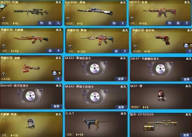98K-星神,M200-幻神,HK417-朱雀,世冠全套《雷神火麒麟柯尔特龙啸》火麒麟绝迹,毁灭SV冠军,雷神N9冠军,冠军之心之怒之魄,雅典娜,火麒麟雷神毁灭黑骑士激光音效卡,CFS2020-毁灭,荣耀之魄,CFS2018火麒麟修罗两把,耀金黑骑士毁灭,传奇白鲨-70KG-AG火麒麟,COP-堕天神三个,夜魔套:M4A1-夜魔,马来剑夜魔,VEPF-金魔,破空夜魔,凌霄,手雷闪光弹烟雾夜魔七个。升级王者之魄之悦心之啸之击。炫金雷神骑士两把武士毁灭两把天龙,王者之武之怒之灵悦蓝。7烈龙1盘龙3炼狱死亡之眼迷你生化手雷生化全装,满步满狙满副满刀爆破全装,双全装玩偶万化皮肤光效。
