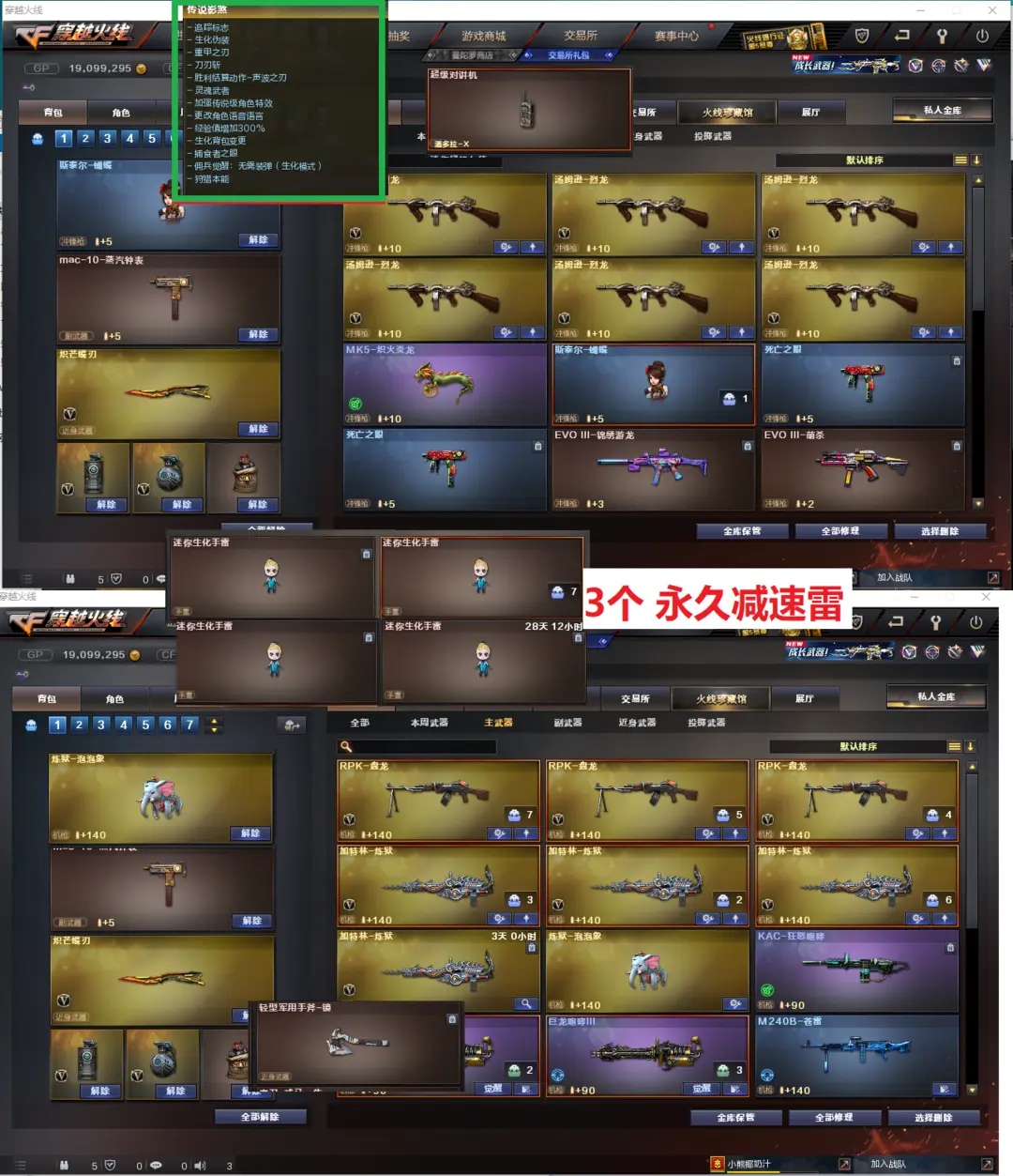 排位:可以---------------生化四防极品号(可以变更生化背包、可以查看生化僵尸血量):无需换弹、6烈6盘龙、炼狱泡泡象、KAC狂怒咆哮、斯泰尔蝴蝶、死亡之眼、MAC涂鸦、手斧镜 、蝴蝶刀、3个永久生化减速雷、超级对讲机、全部弹匣、、。爆破全装:幻神音效2皮肤(宠儿、巅峰荣耀)、王者星神、USP雷暴、柯尔特竞技荣光、COP雷霆、、、、QBZ金色蔷薇、白虎、5套雷霆、4套雷暴、7套竞技荣光、、、爆破人物(晴雅、云悠悠、暗夜审判)、生化人物(传授影煞、葵-赛.博.朋 .克)