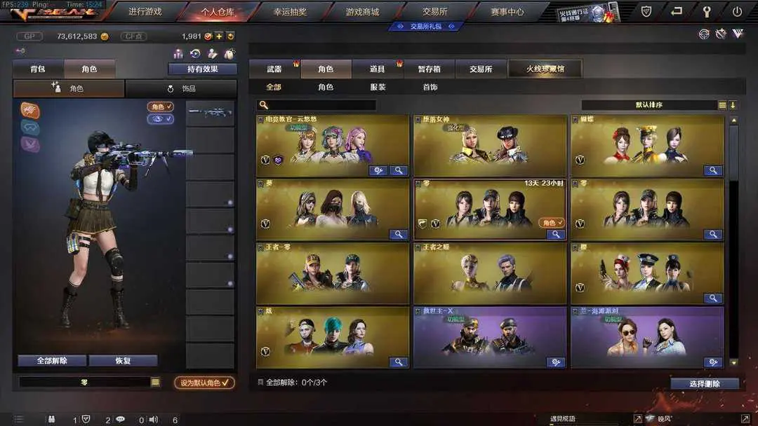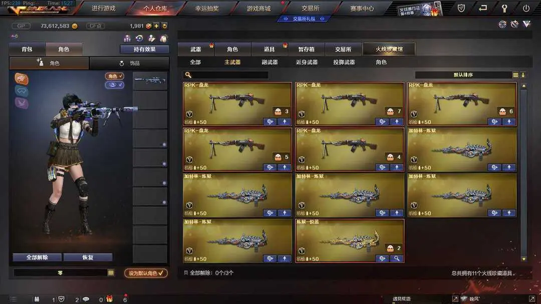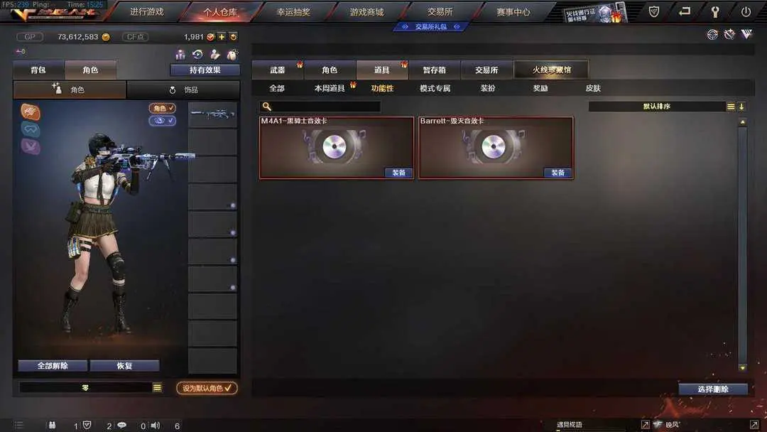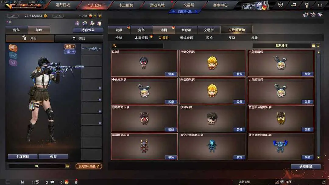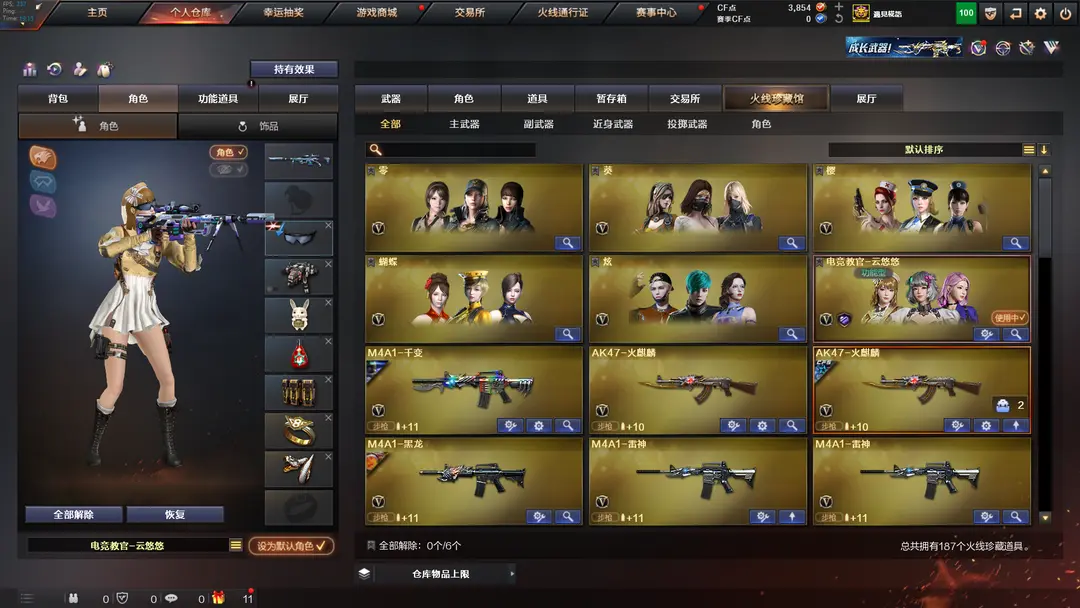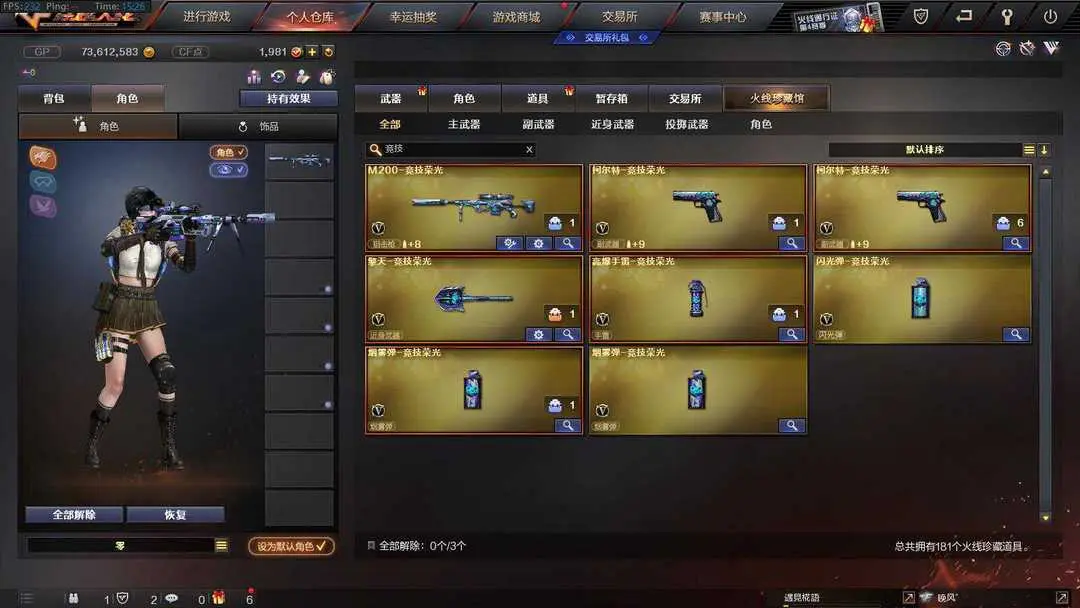 本游戏账号:英雄武器168个; 王者武器17个。 可以玩爆破号、生化号、双全装、稀有武器、等模式。装备不多,但是主武器、副武器、近身武器够用 拥有完美游戏体验。重要的是,特殊装备有:AN94-超新星、破空枪刃、M4A1-黑骑士、M4A1-玫瑰精灵、AK47-黑武士、麒麟刺、AK47-火麒麟、AWM-天龙、Barrett-毁灭、QBZ95-幻兽、加特林-炼狱、M4A1-雷神、沙鹰-幻兽、M4A1-黑龙、M4A1-雷霆、AA-12-雷霆、麒麟刺-堕天神、闪光弹-堕天神、烟雾弹-堕天神、USP-雷暴、雷霆之怒、雷霆之契、雷霆之锋、黑骑士-海王、M200-竞技荣光、擎天-竞技荣光、柯尔特-竞技荣光、烟雾弹-竞技荣光、闪光弹-竞技荣光、高爆手雷-竞技荣光、王者之戮、王者之武、王者之锋、超新星-悦享、玫瑰精灵-悦动、炫金天龙、炫金武士、炫金天神、炼狱-悦蓝-觉醒版、王者之怒-觉醒版、潘多拉、堕天使、雷霆-β、王者之瞳、蝴蝶、圣诞潘多拉-X、王者-零、Barrett-毁灭音效卡、M4A1-黑骑